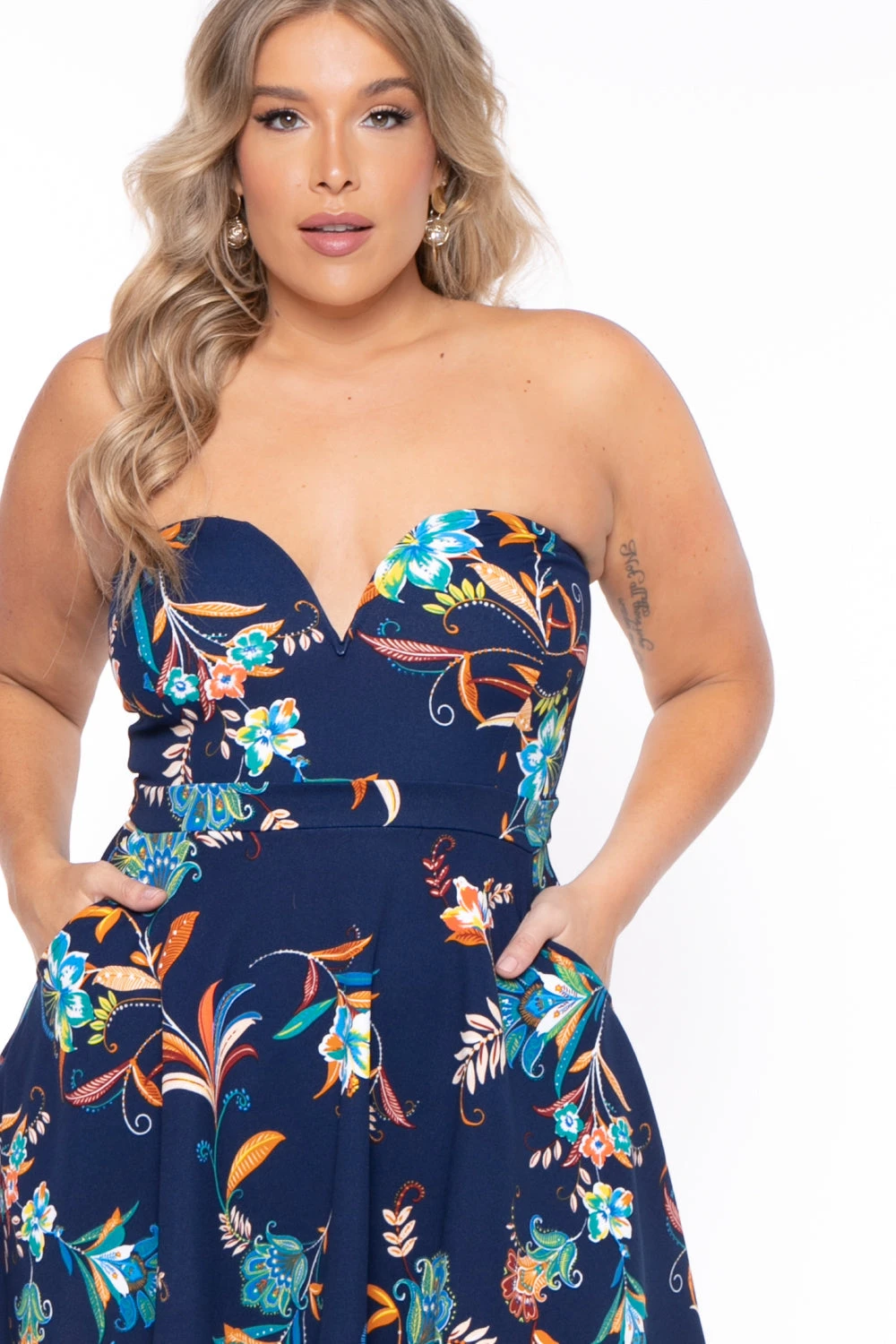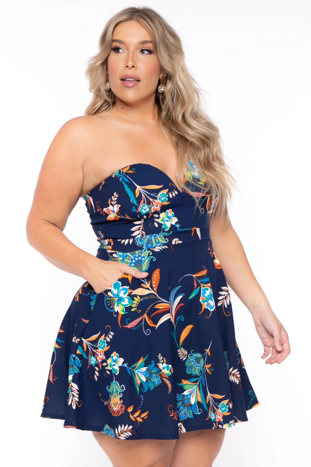 This plus size, stretch knit crepe dress features an all over floral design, sweetheart neckline, V-Wire detail, this A-line flare silhouette, and this dress has pockets.