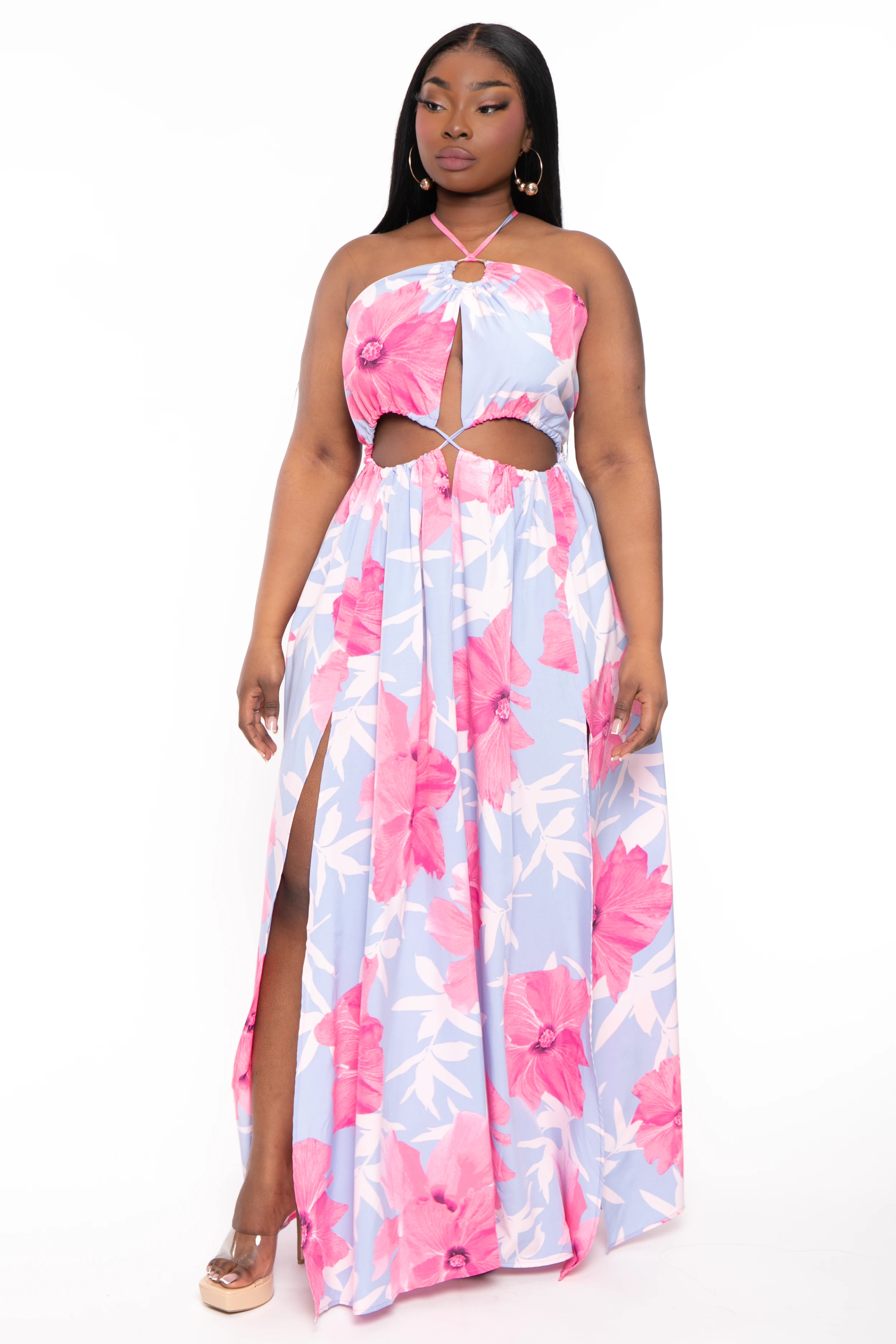 This plus size, floral print dress features a halter neckline o-ring detail, twist front with an adjustable tie, cut out waist, m-slit, an open back with self tie detail, and a flowy long maxi silhouette.