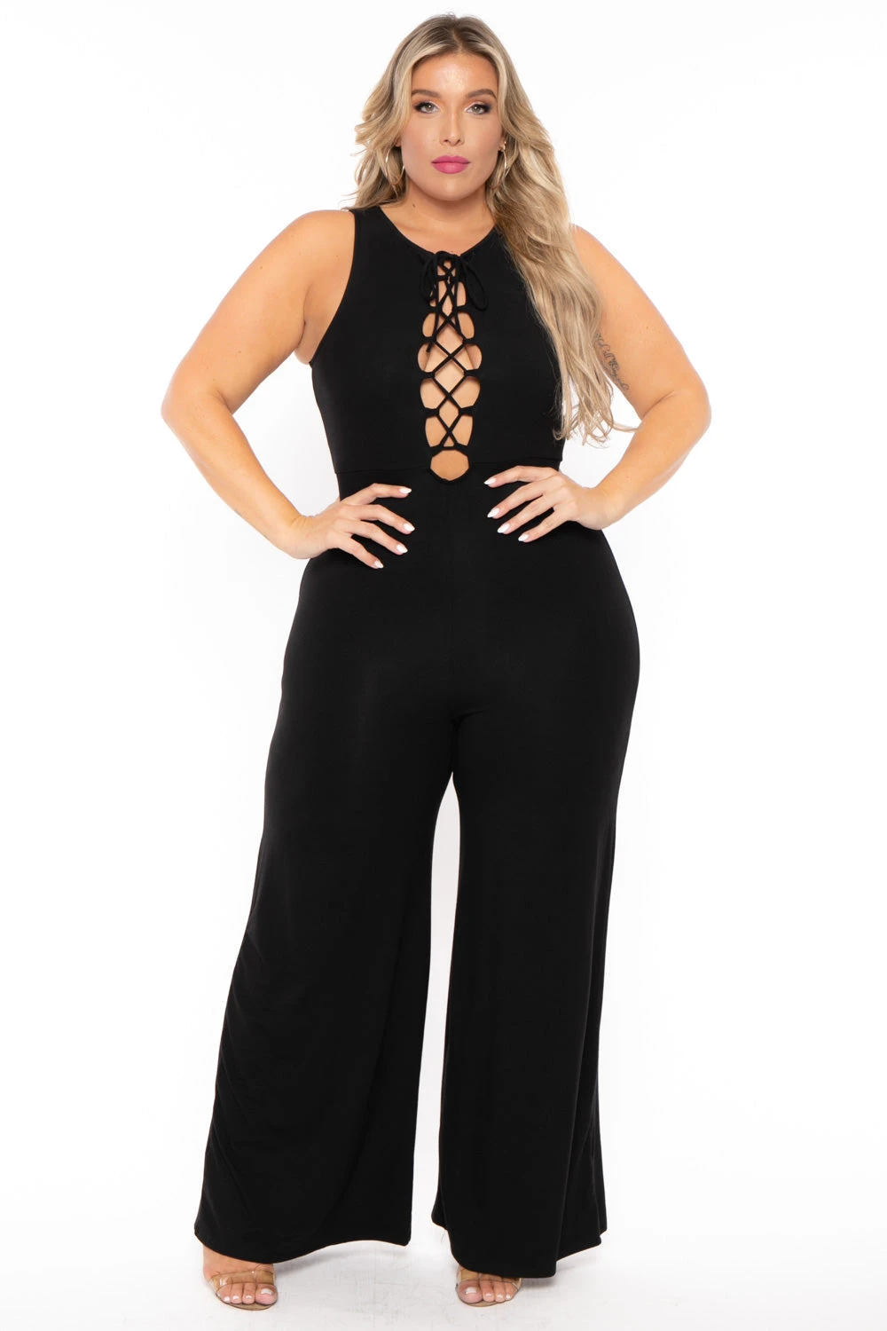 This plus size, jumpsuit features a sexy front criss cross cut out, no sleeves, wide leg bottoms, and keyhole cutout in the back with dome button closure