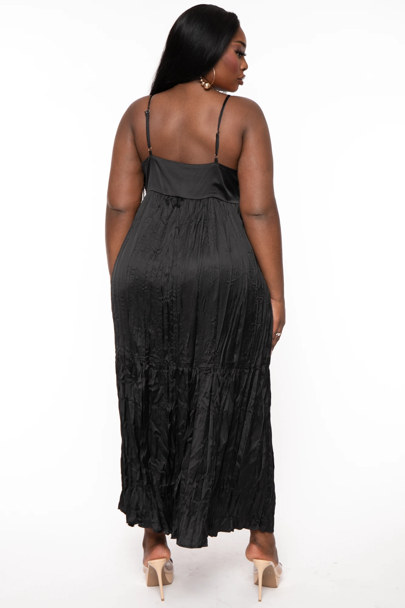This plus size satin dress features a crinkle material, sweetheart neckline with u-ring detail at the bust, adjustable cami straps, hidden back zipper and a tired maxi length