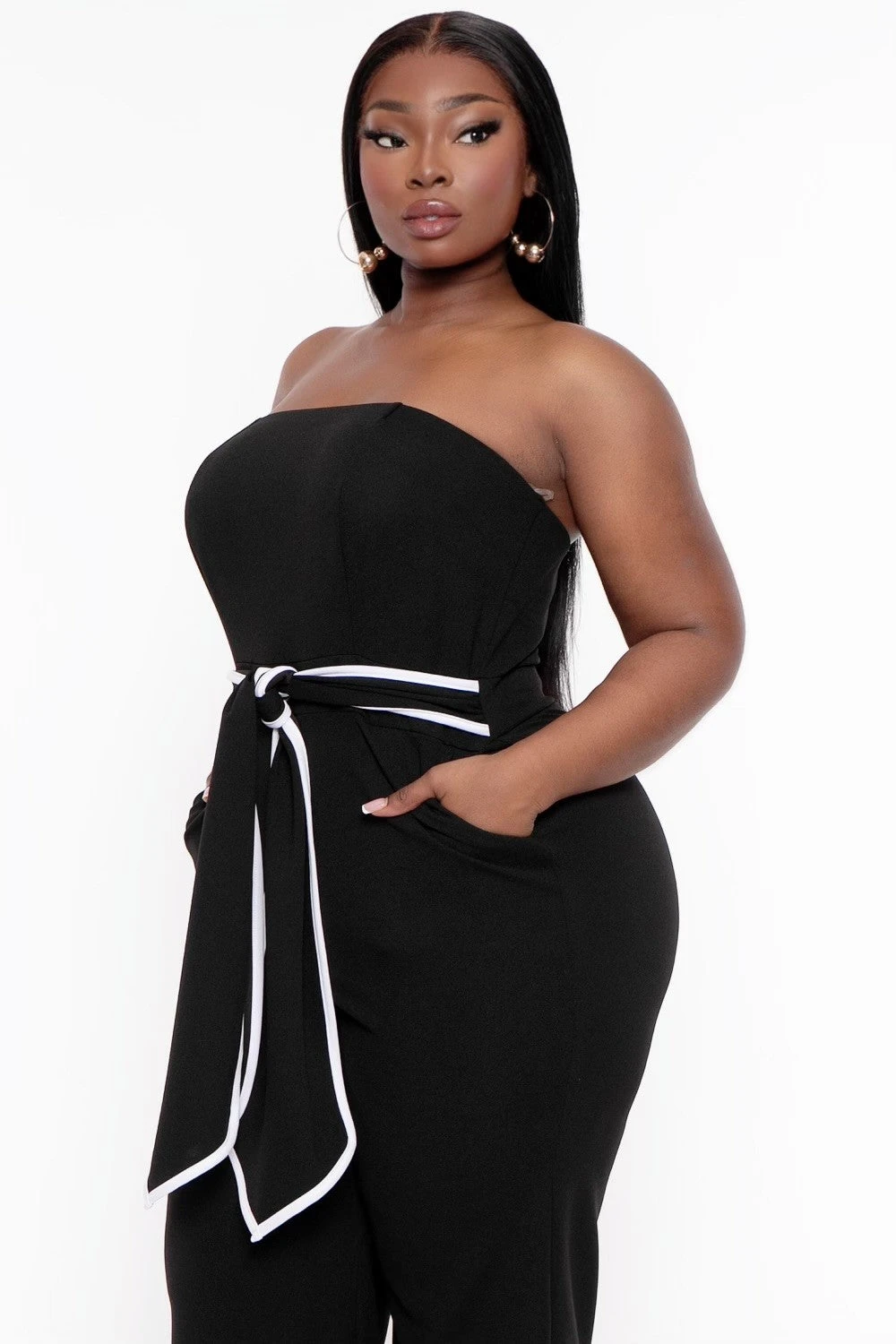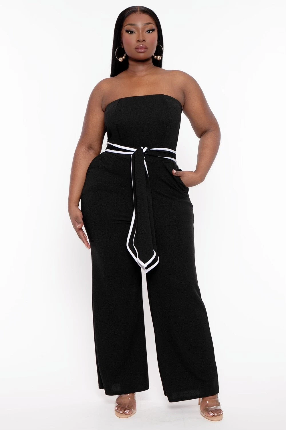 This plus size sleeveless jumpsuit features a straight neckline, self tie belt and a wide leg pant