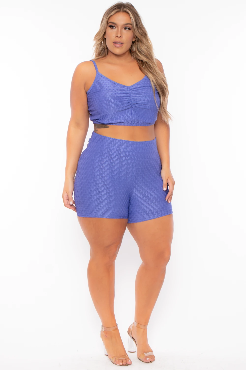 This plus size, stretch knit ribbed two-piece set features an all over textured design, a crop top with a round neckline, sleeveless, adjustable cami straps, and front center elasticized ruching. Paired with matching biker shorts with an elastic high-waist, back center elasticized ruching, and mid-thigh length hem.