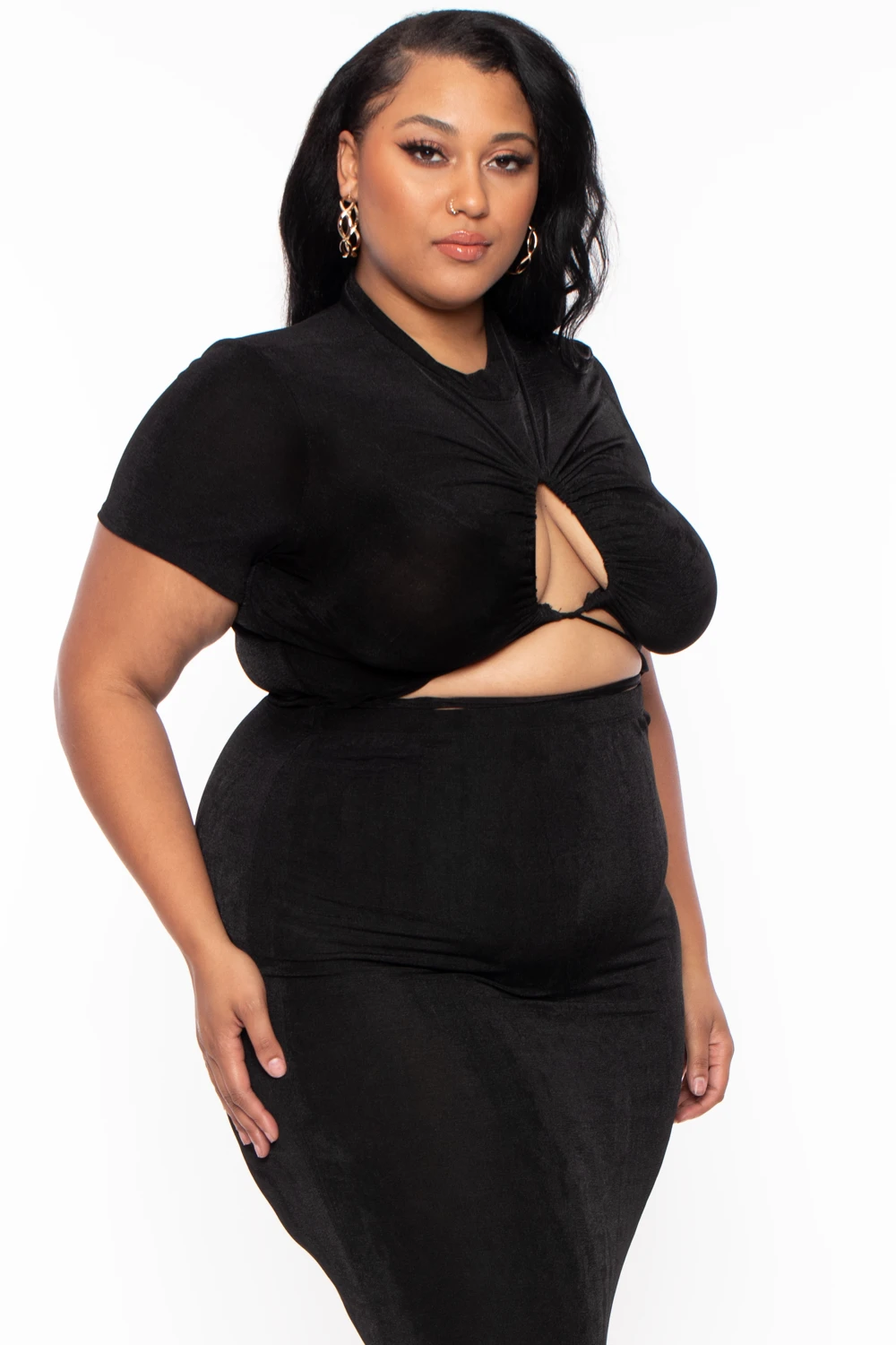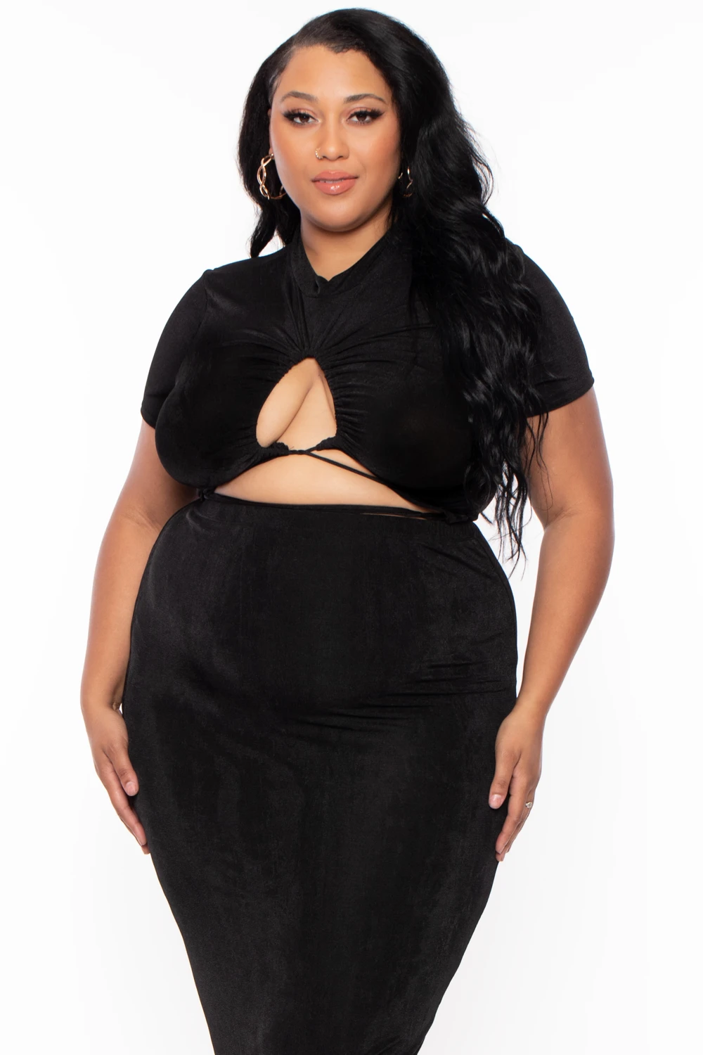 This plus size stretch knit two-piece set features an all over slinky fabric, a top with a mock neckline, short sleeves, a center adjustable drawstring tie front that forms a keyhole, and a cropped hem. Paired with a matching over the belly skirt with an elasticized waist and a form fitting maxi length silhouette.