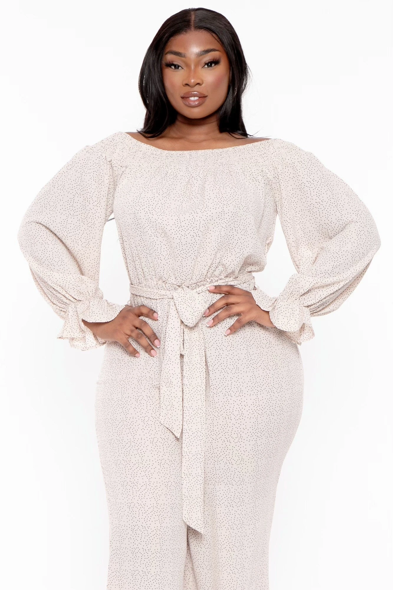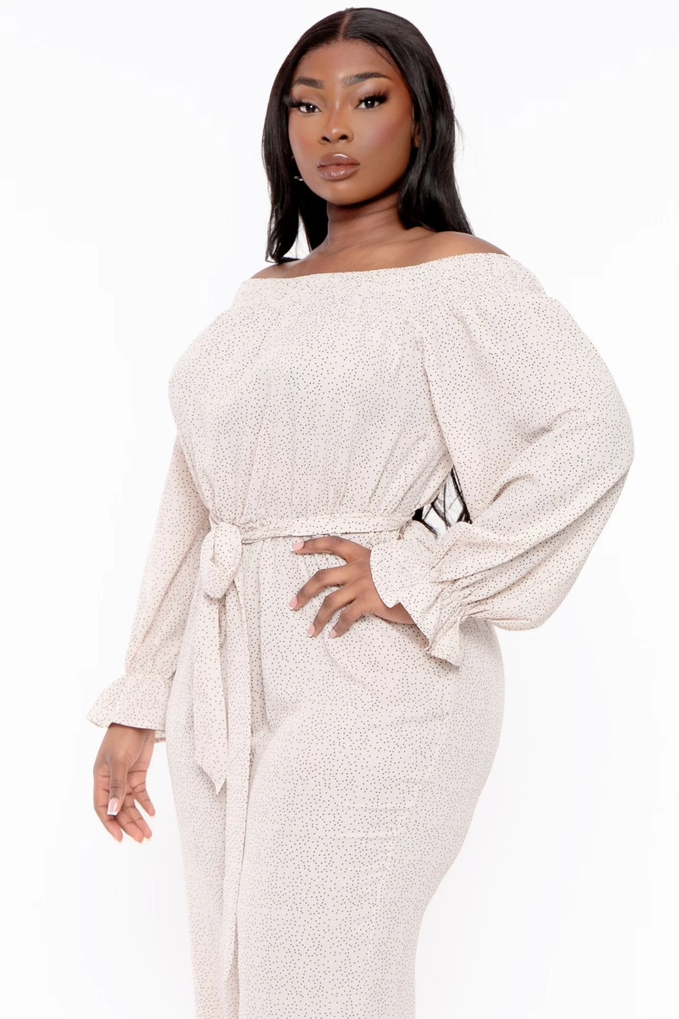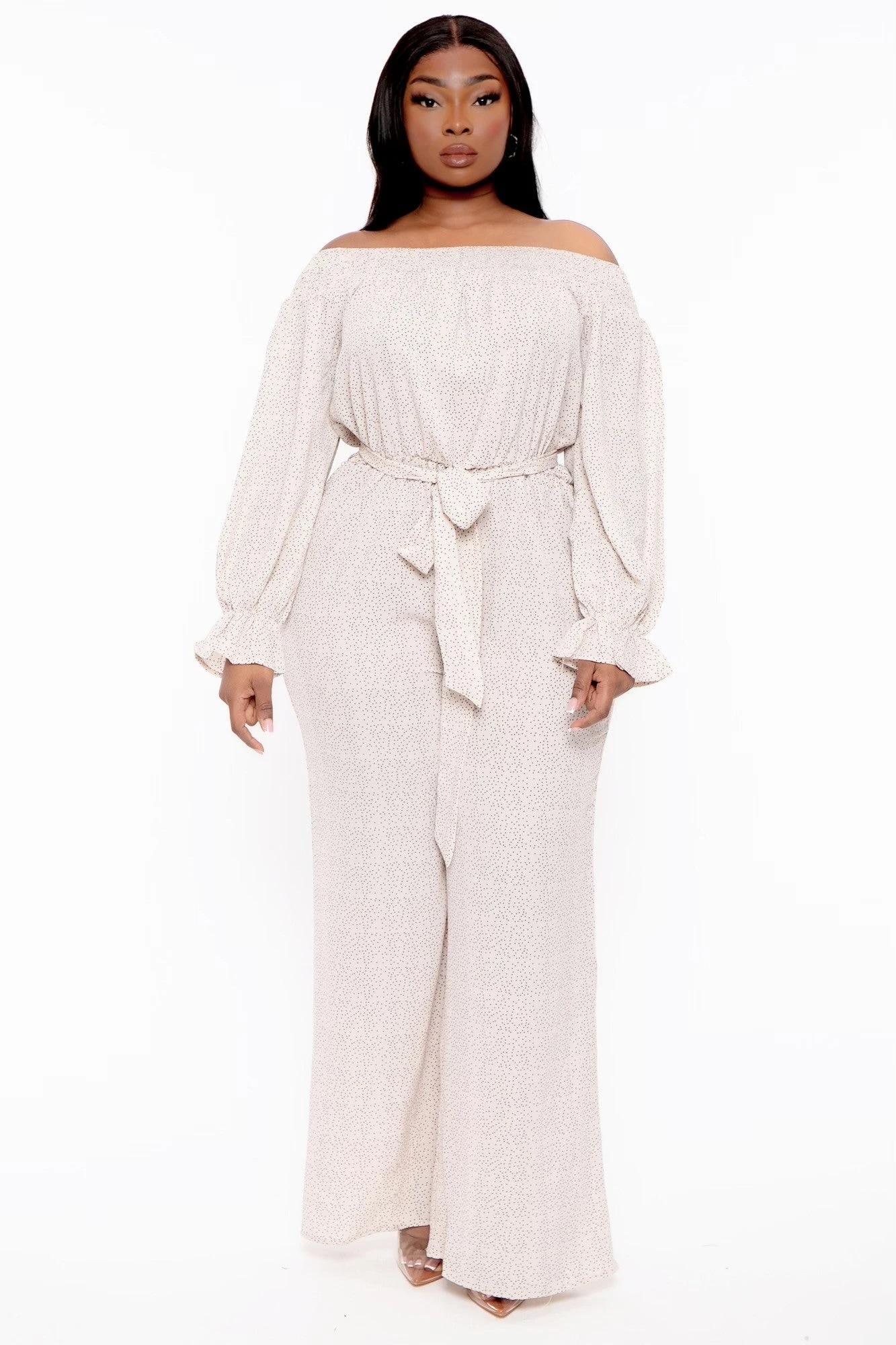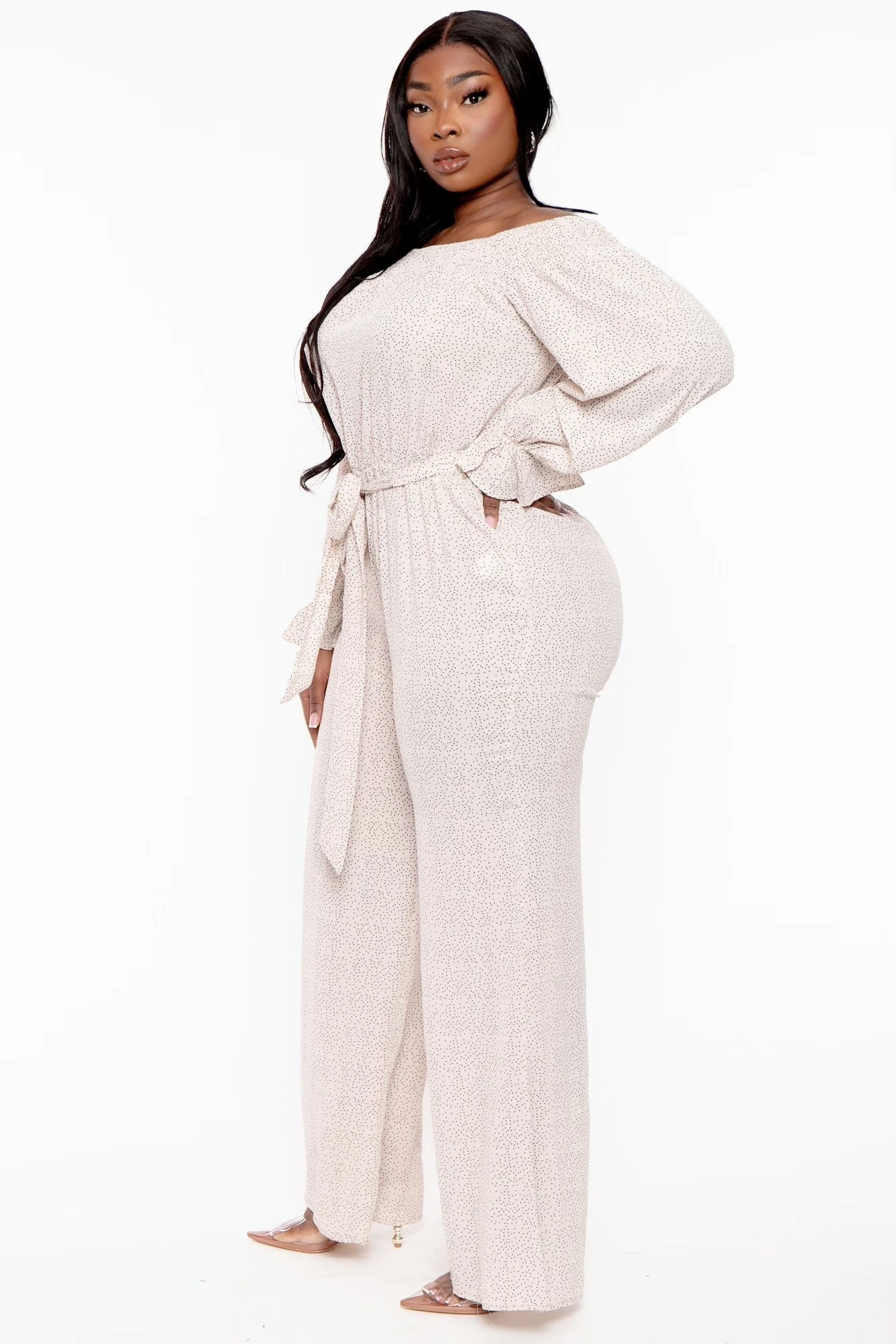 This plus size jumpsuit features an all over dot print, off the shoulder neckline, long sleeves, self tie belt sash and a wide flared hem leg.