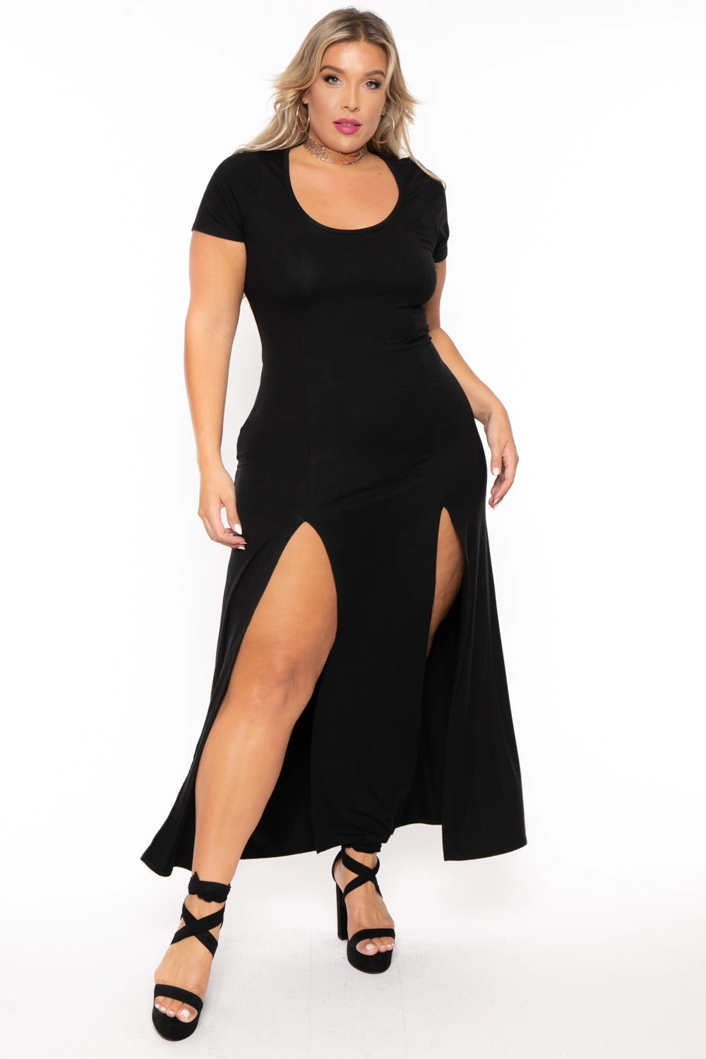 This plus size, stretch knit dress features a scoop neckline, long sleeves, princess seams, and a dramatic front M-slit