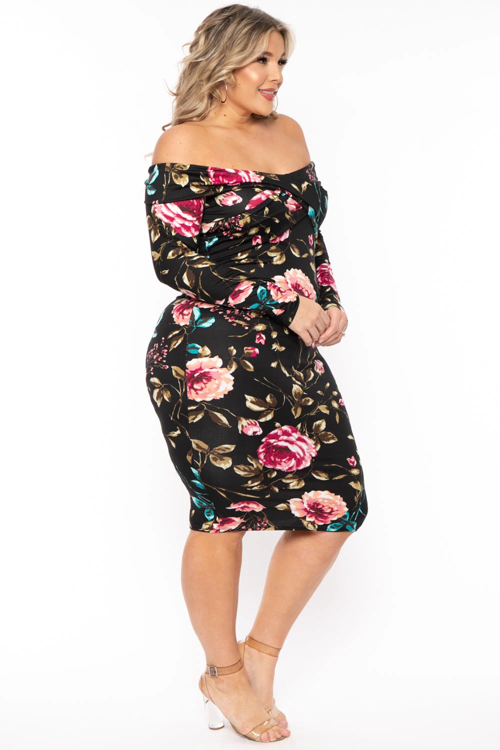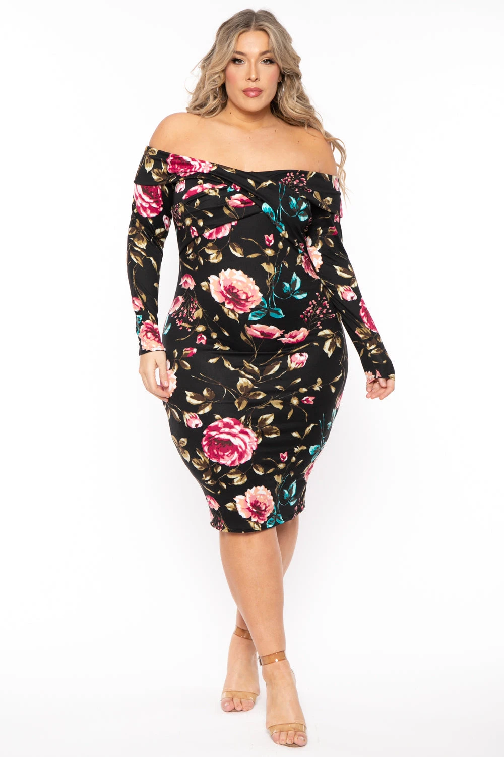 This plus size knit dress features an all over floral print, an off the shoulder a sexy crossover design that drapes beautifully across your shoulders. This material is incredibly soft light brushed material with long sleeves.