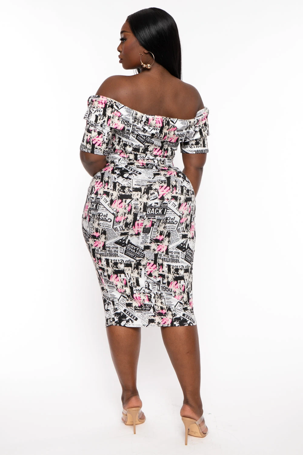 This plus size, off the shoulder dress features an all over newspaper print, a sexy crossover design that drapes beautifully across your shoulders. This material is incredibly soft light stretch knit material in a bodycon silhouette