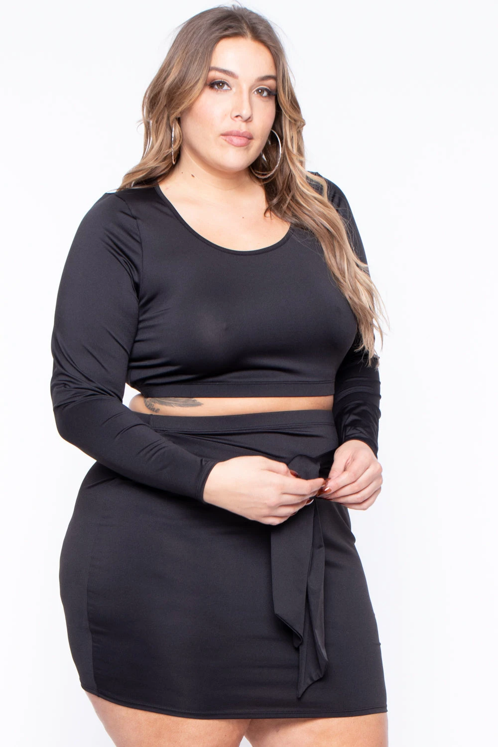 This plus size, stretch knit two-piece set features a crop top with long sleeves, a matching minnie skirt with an elastic waist and an sash tie belt detail, and form fitting silhouette