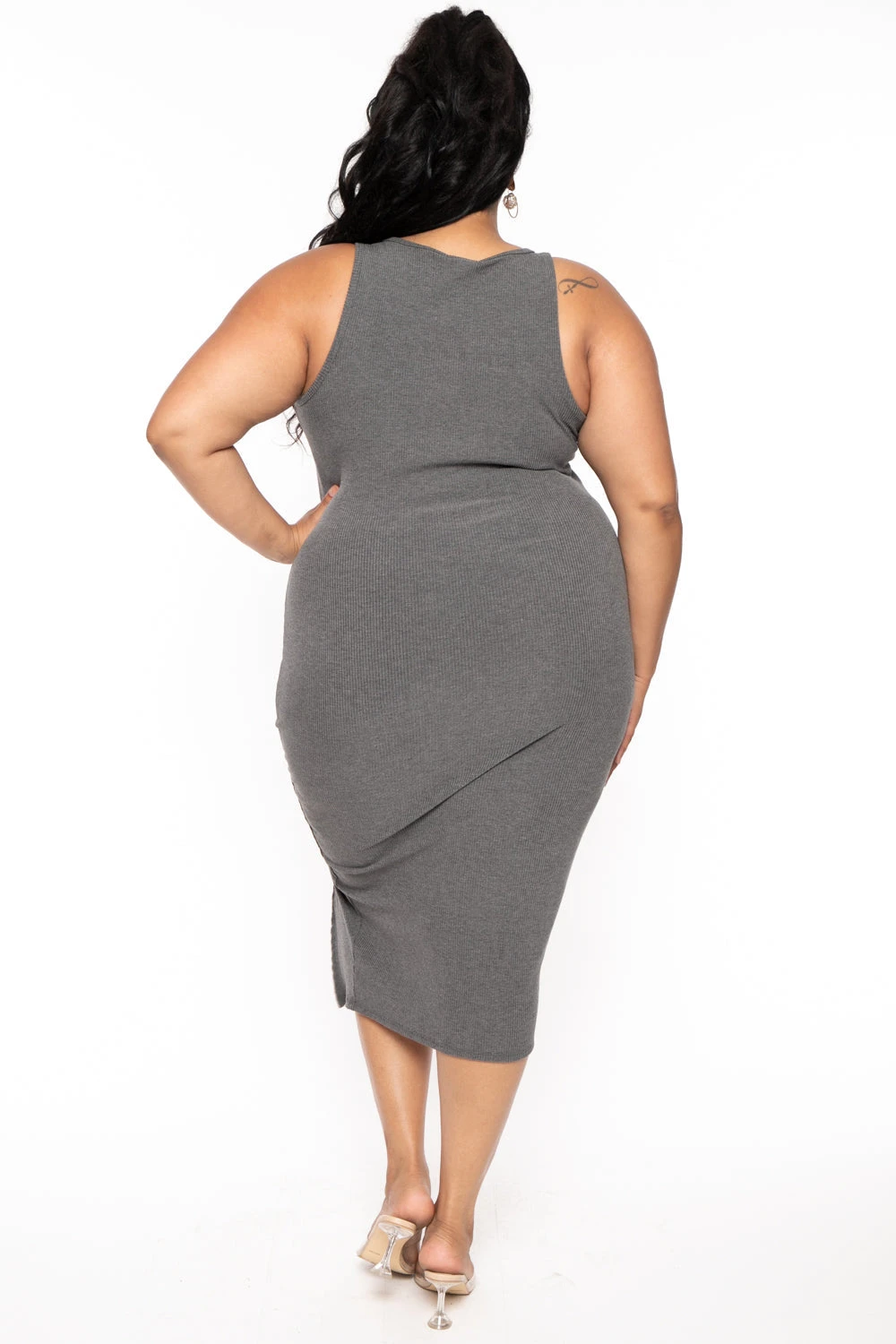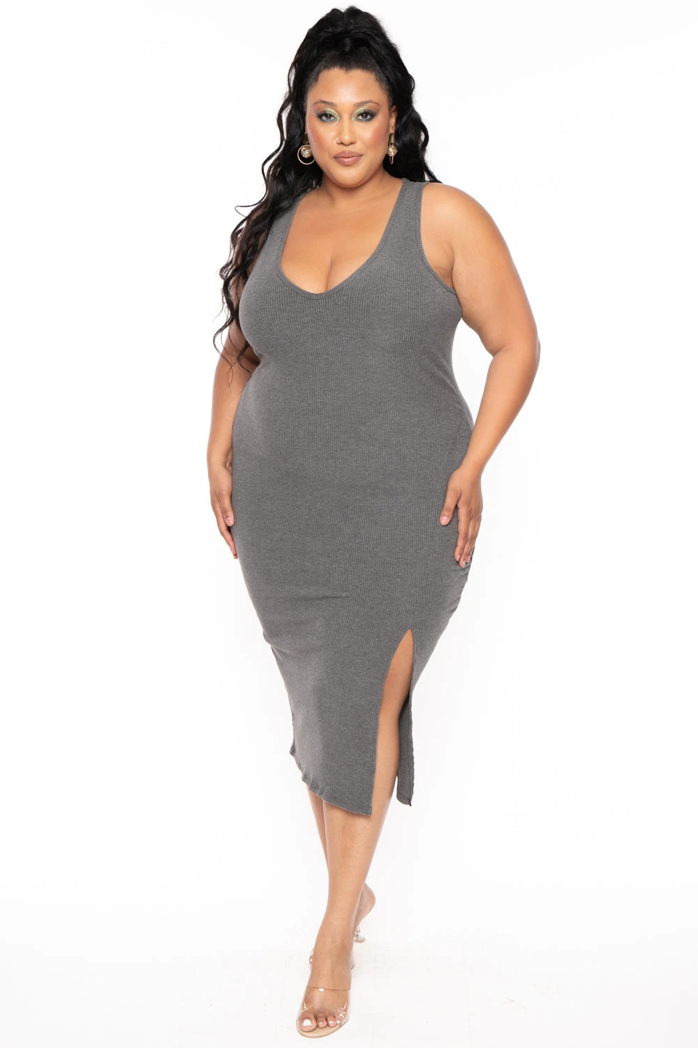 This plus size, bodycon dress features a lightweight ribbed knit material, curve hugging silhouette, sleeveless, deep v neckline and thigh slit detail