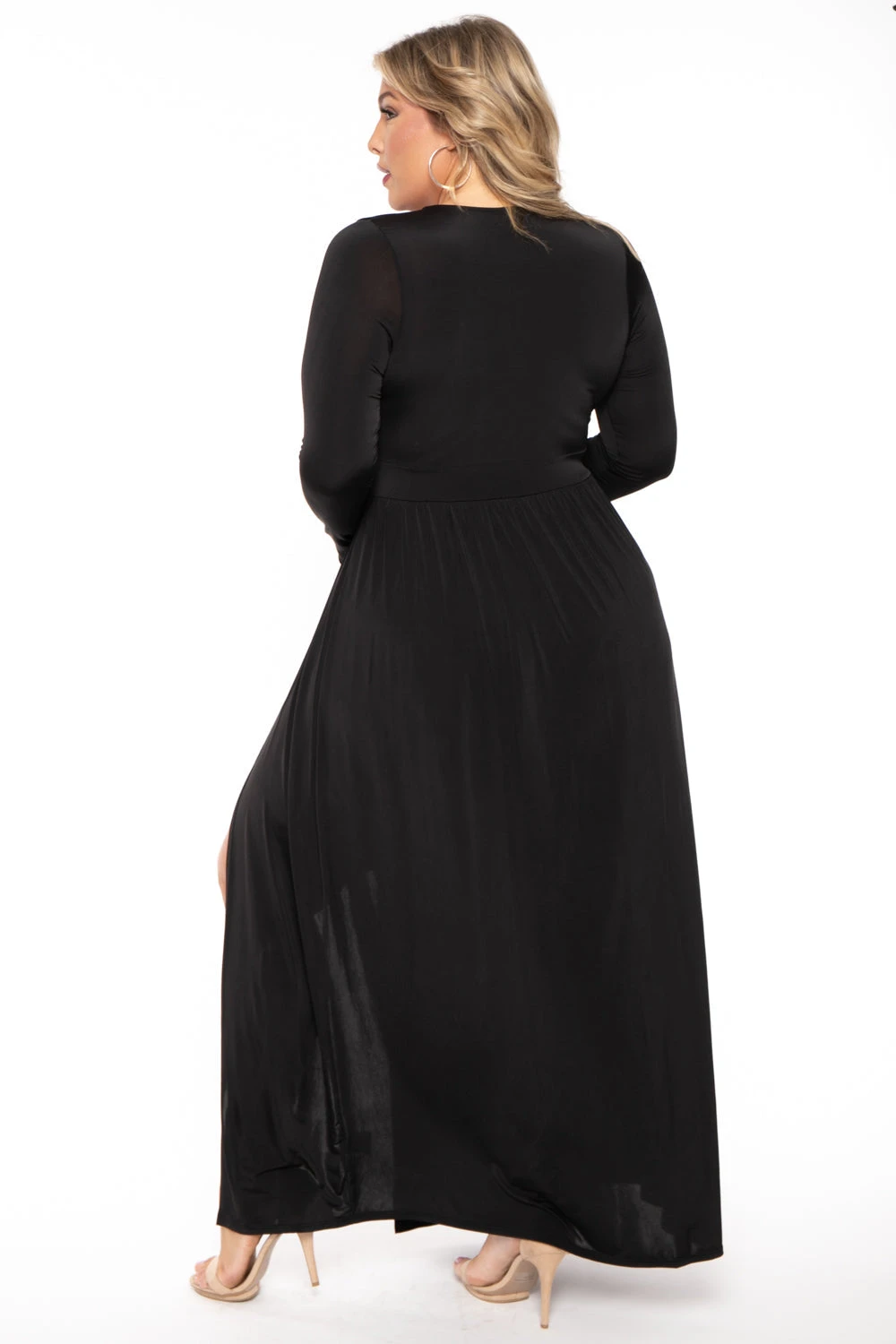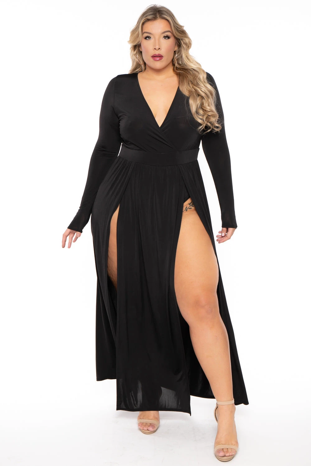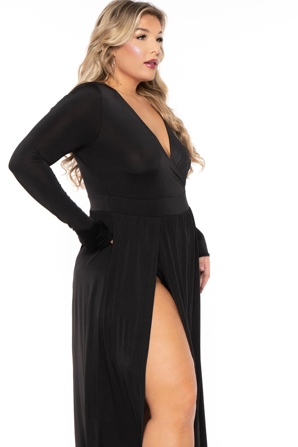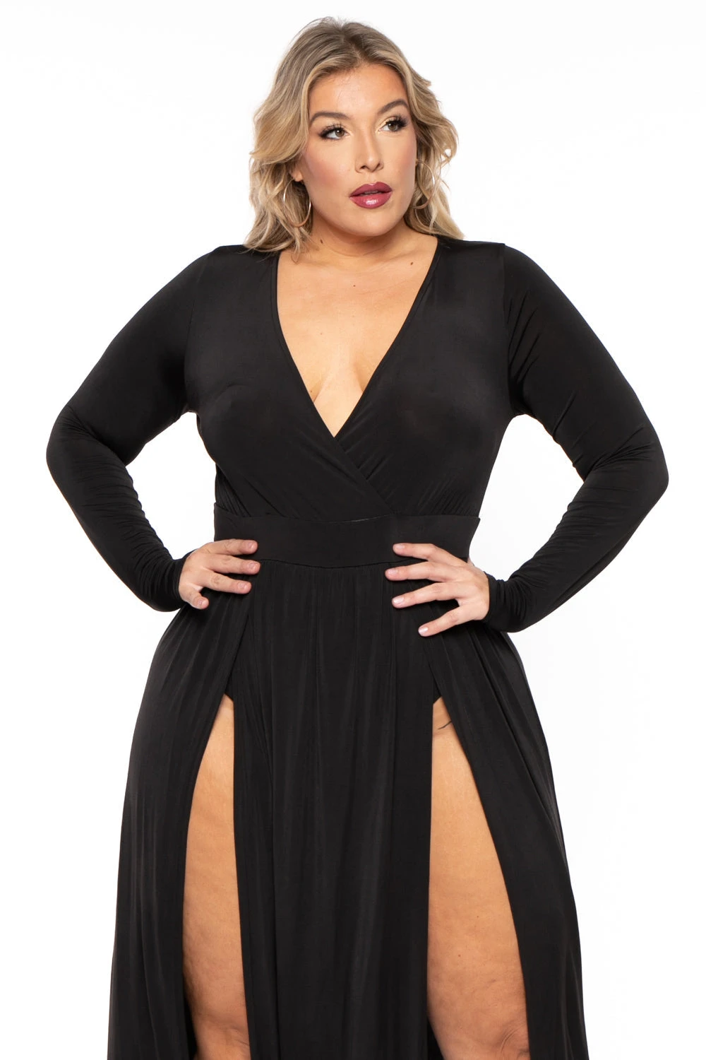 This plus size, stretch knit maxi dress features a plunging surplice neckline, long sleeves, attached bodysuit, and a dramatic front M-slit.