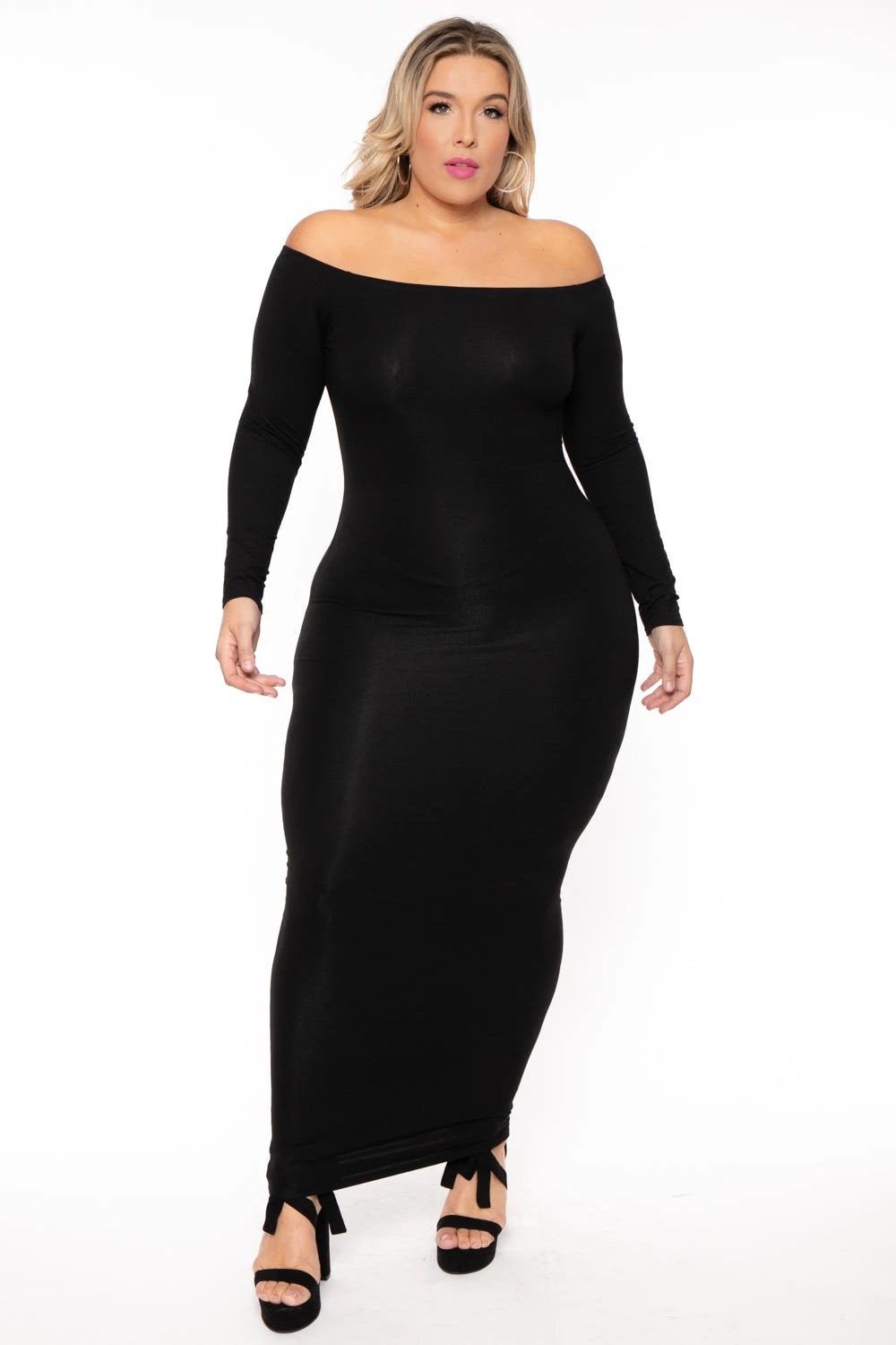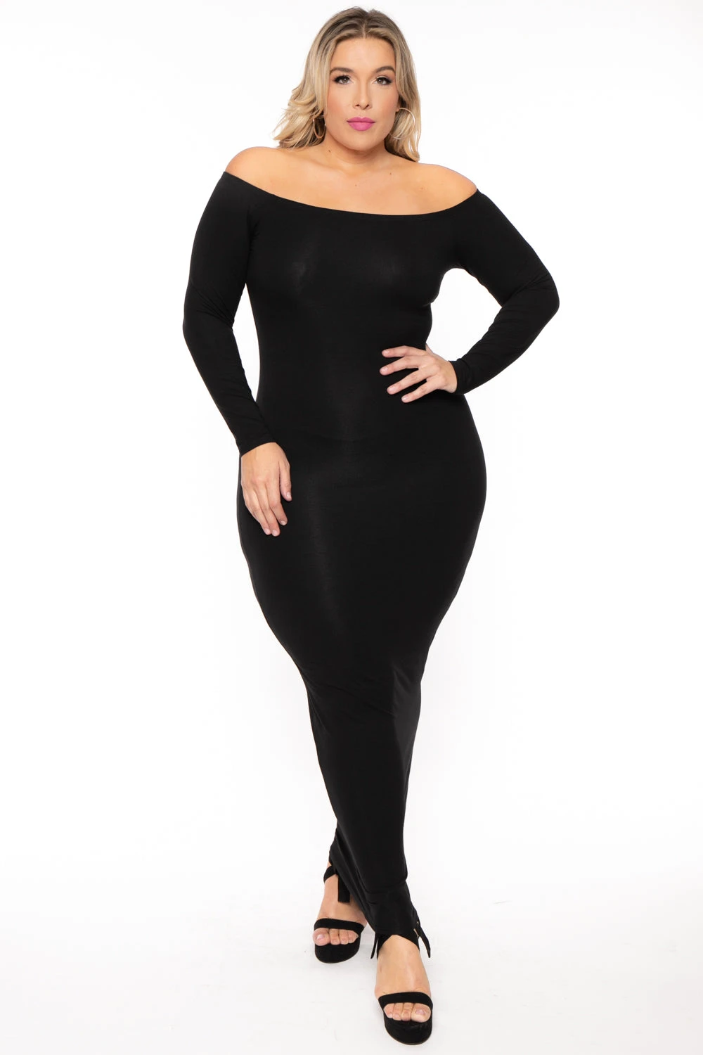 This plus size, stretch knit maxi dress features an elastic off the shoulder neckline, long sleeves, and a bodycon silhouette.
