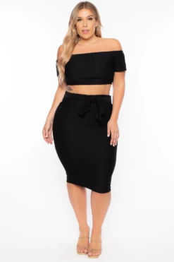 This plus size, stretch knit ribbed two-piece set features an all over textured design, a crop top with an off the shoulder neckline, short sleeves, a matching skirt with an elastic waist and a sash tie belt detail, and form fitting silhouette