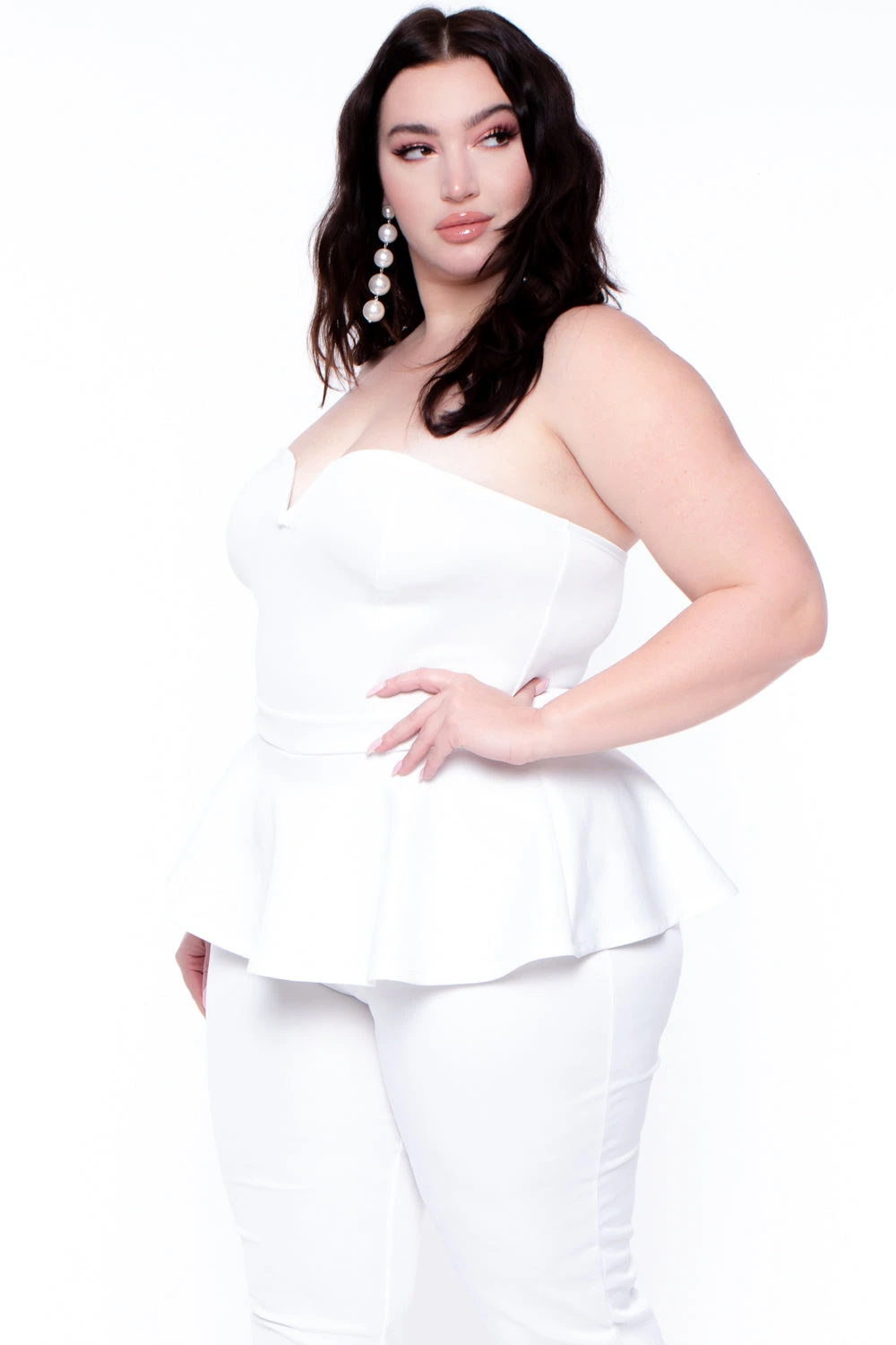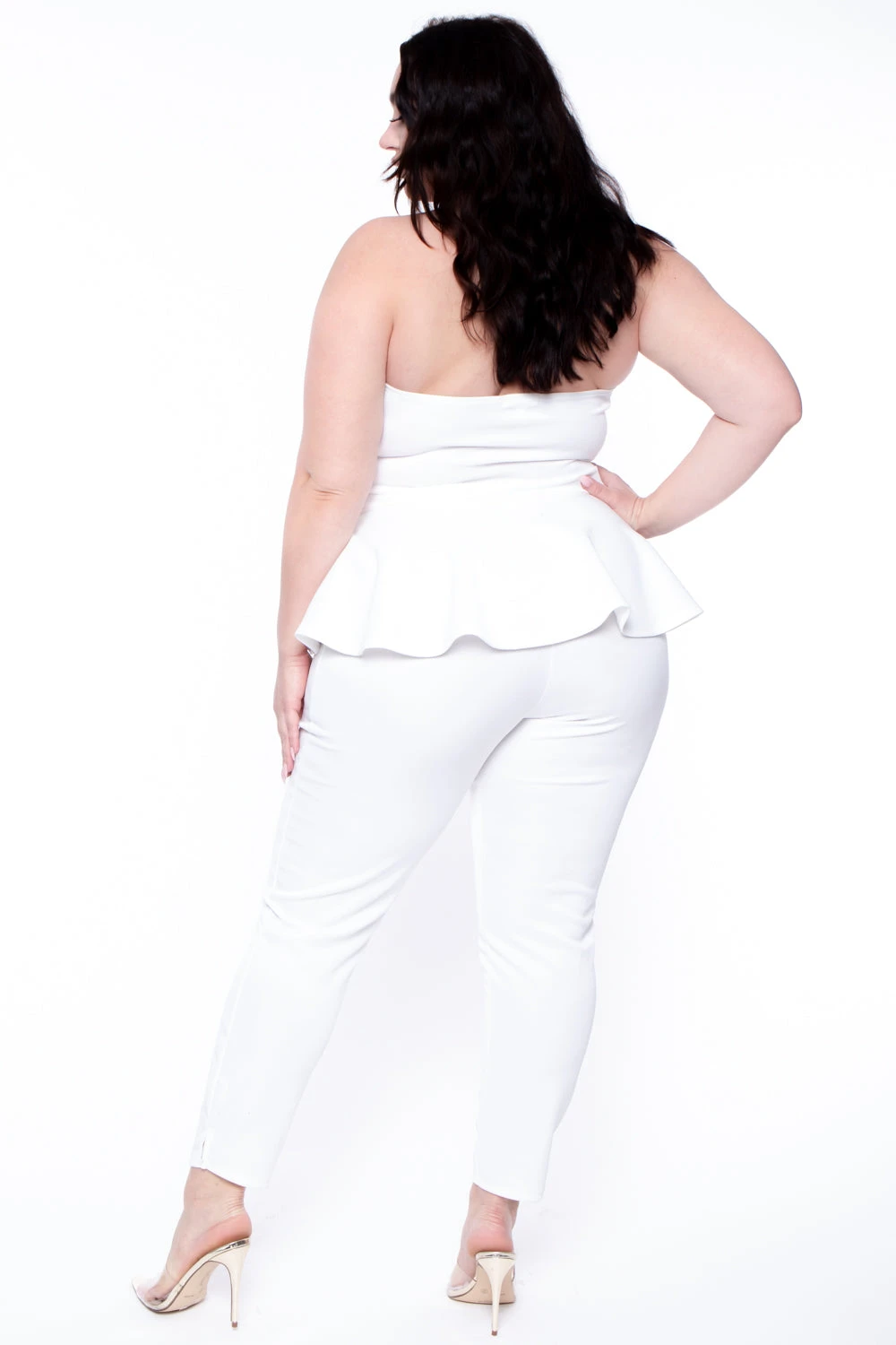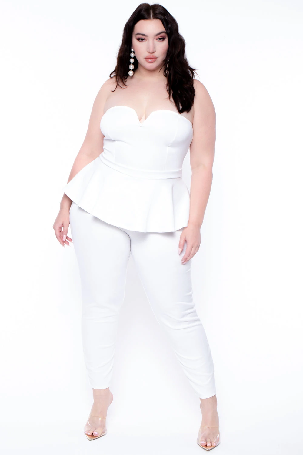 This plus size, stretch knit jumpsuit features an elastic V-neckline with added wire for extra comfort, princess seams, a banded elastic waist, peplum detail at waist, and a skinny leg.