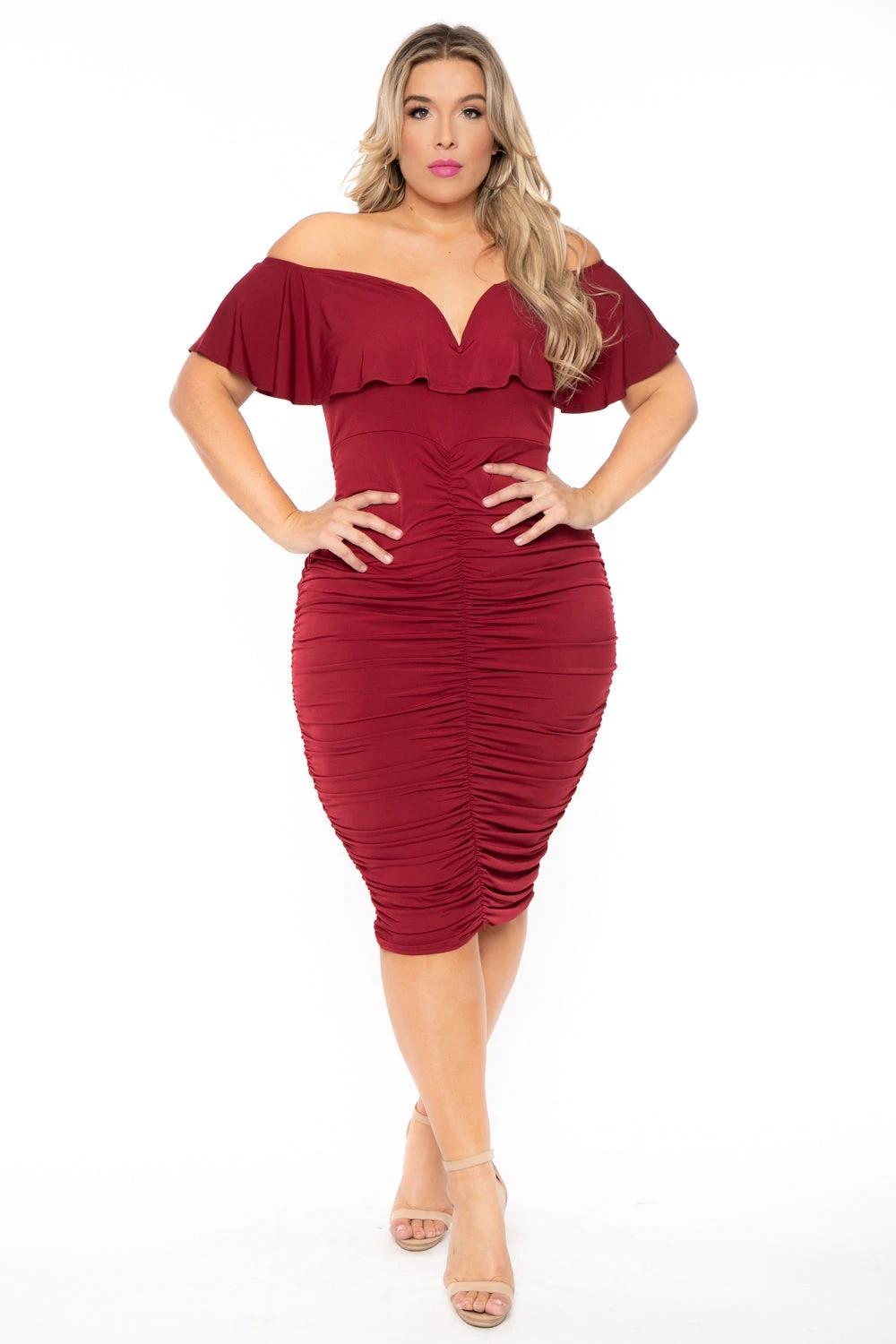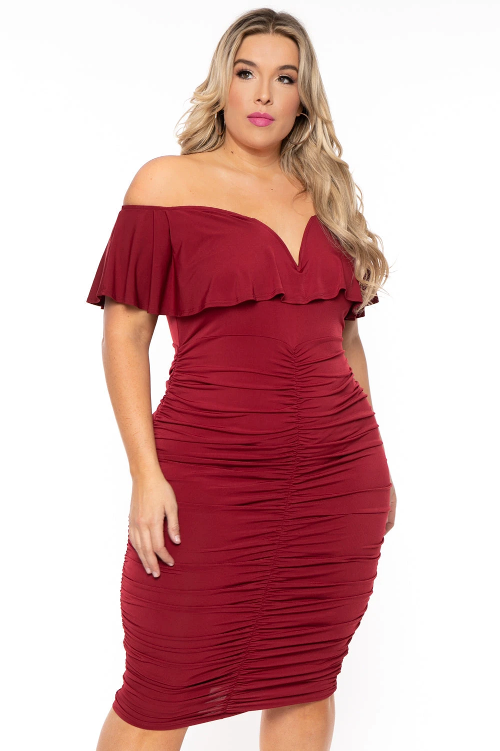 This plus size, stretch-knit dress features an off the shoulder neckline, center V-Wire, flutter sleeves, ruched detailing on the front, sides & back of dress. Bodycon silhouette, midi length.
