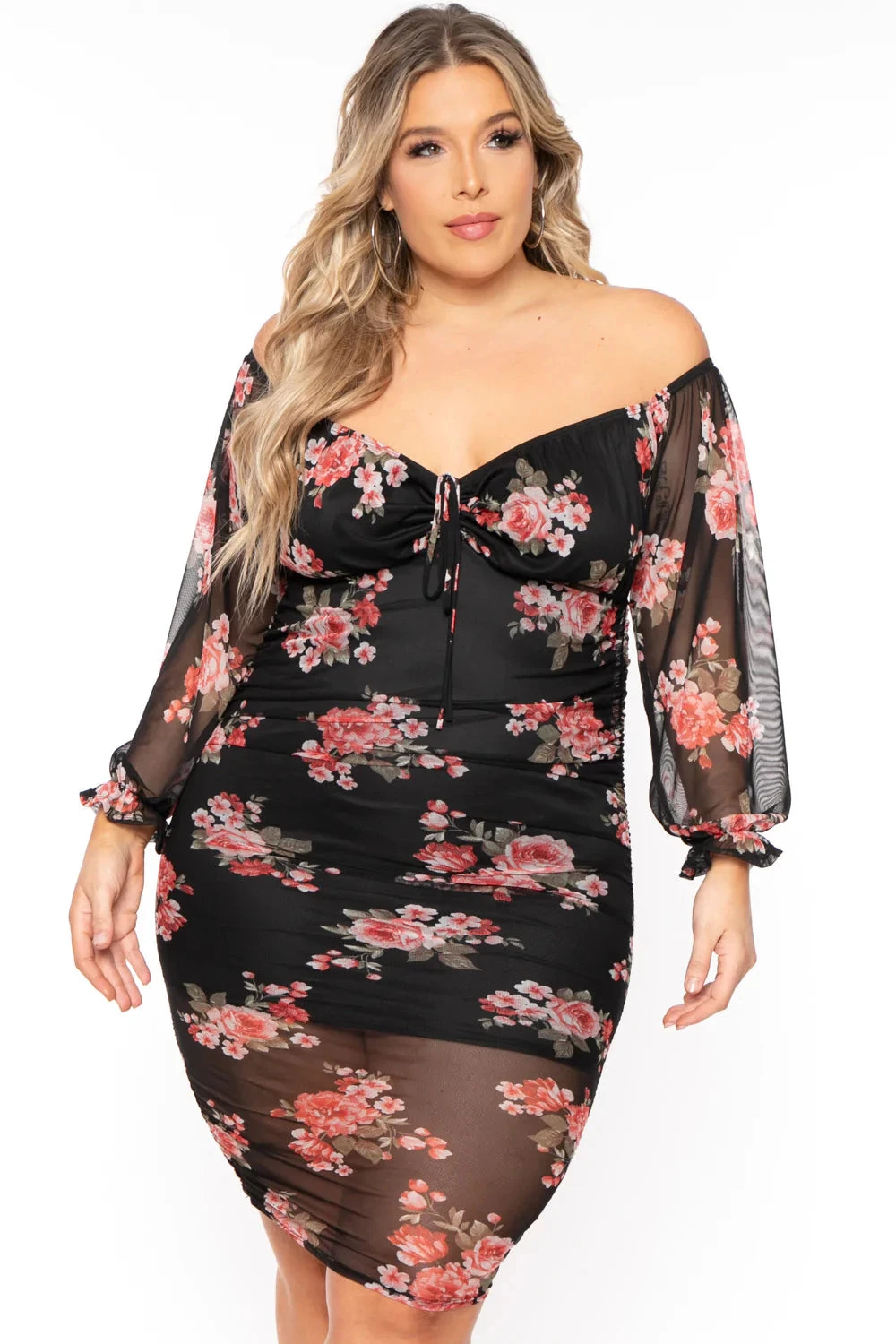 This plus size, bodycon dress features a floral print mesh overlay dress with a curve hugging silhouette, fully lined, off the shoulder neckline., adjustable front tie, and side ruching