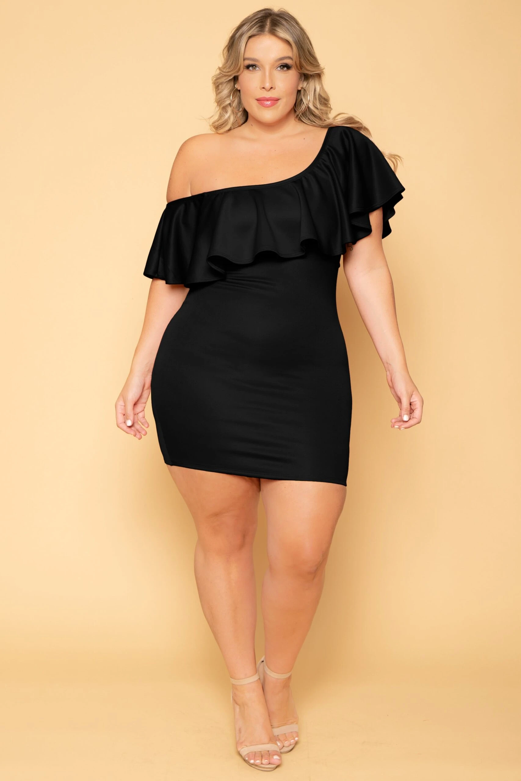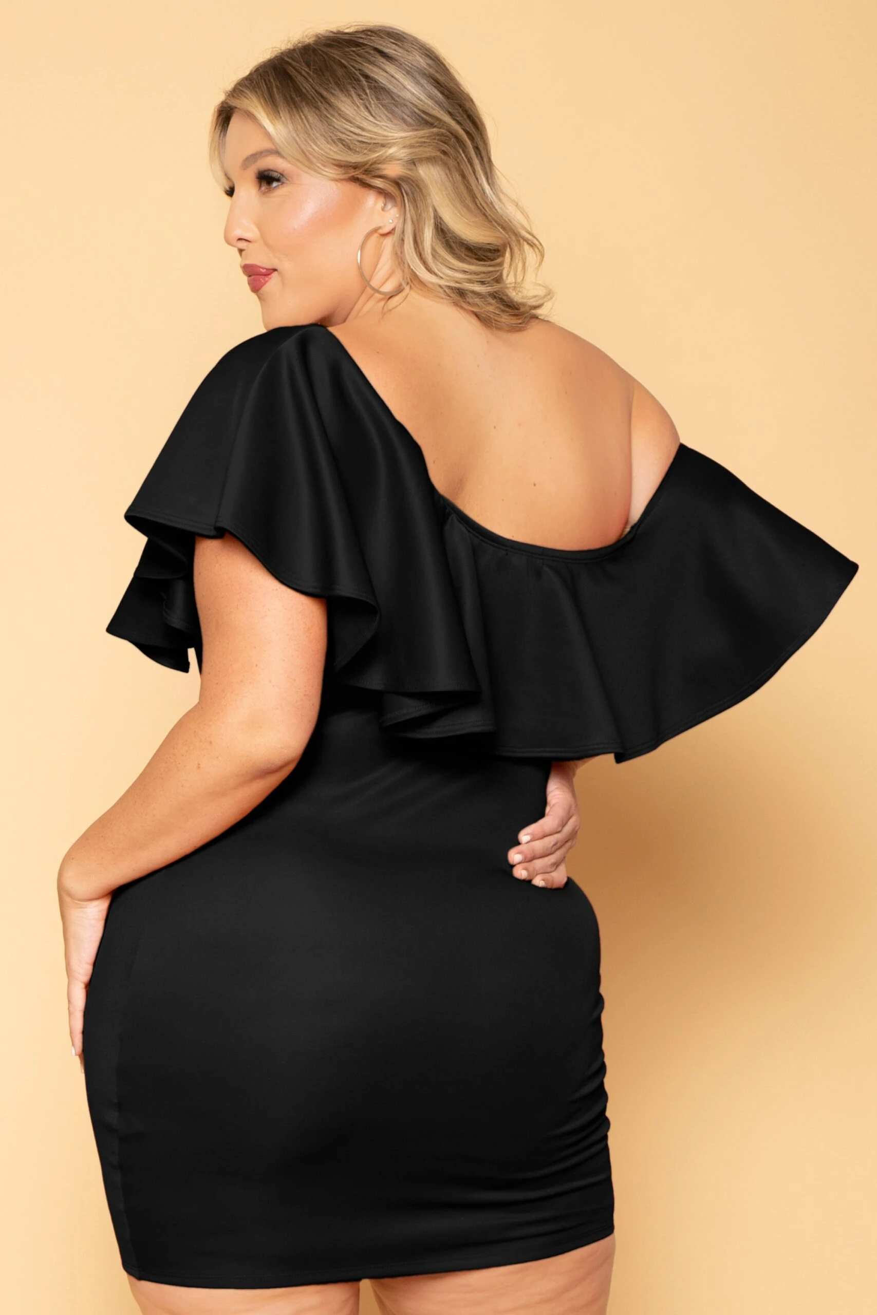 This plus size, bodycon dress features a beautiful floral print, asymmetrical off the shoulder neckline with a ruffled hem, can also be worn off the shoulders!