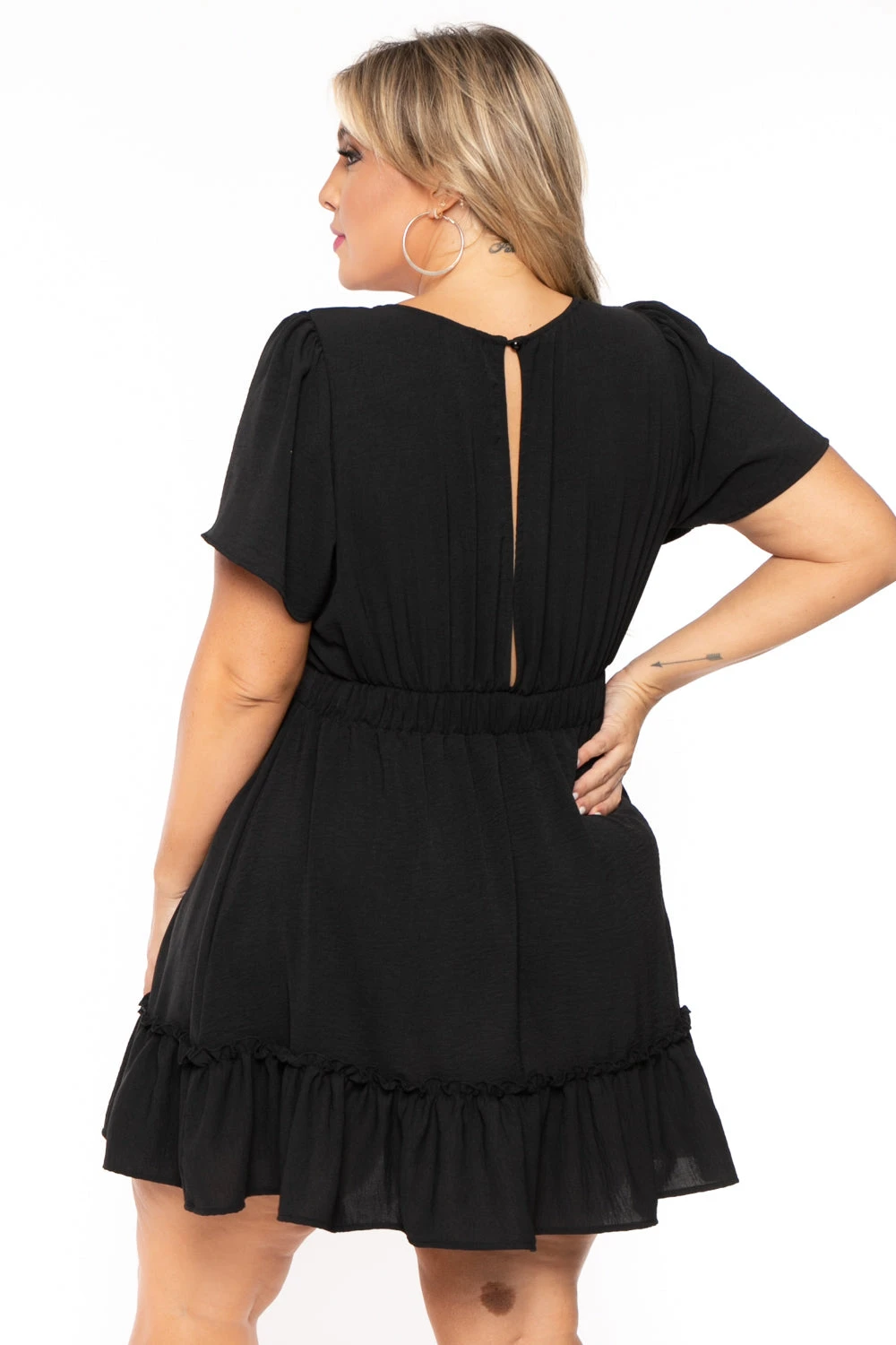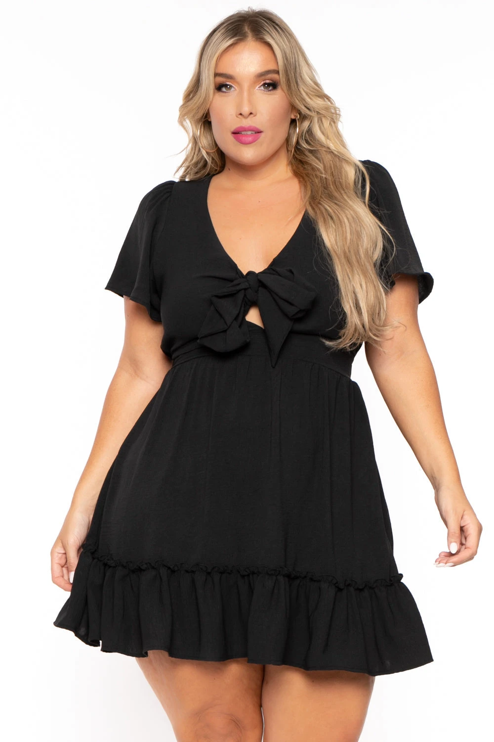 This plus size woven dress features v-neckline front tie with a peekaboo detail, short flowy sleeves, a keyhole back with a dome button closure, ruffle hem, and a flowy in a mini length silhouette.