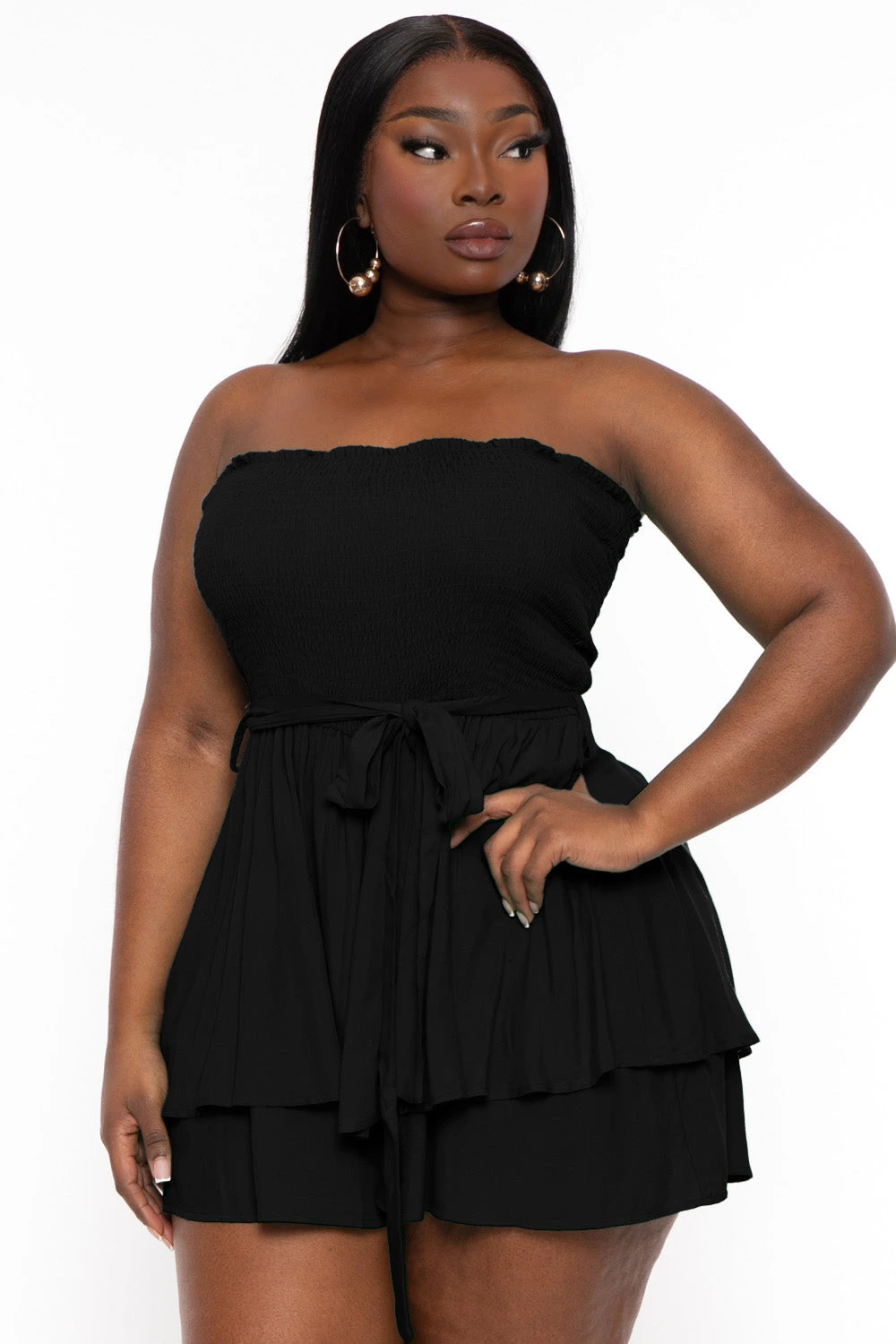 This plus size, stretch knit romper features a straight neckline, tube top, waist sash tie, bottom tiered finished