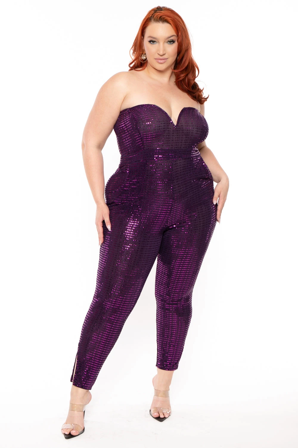 This plus size, stretch off the shoulder jumpsuit features an all over sexy sequin material, plunging neckline and pockets