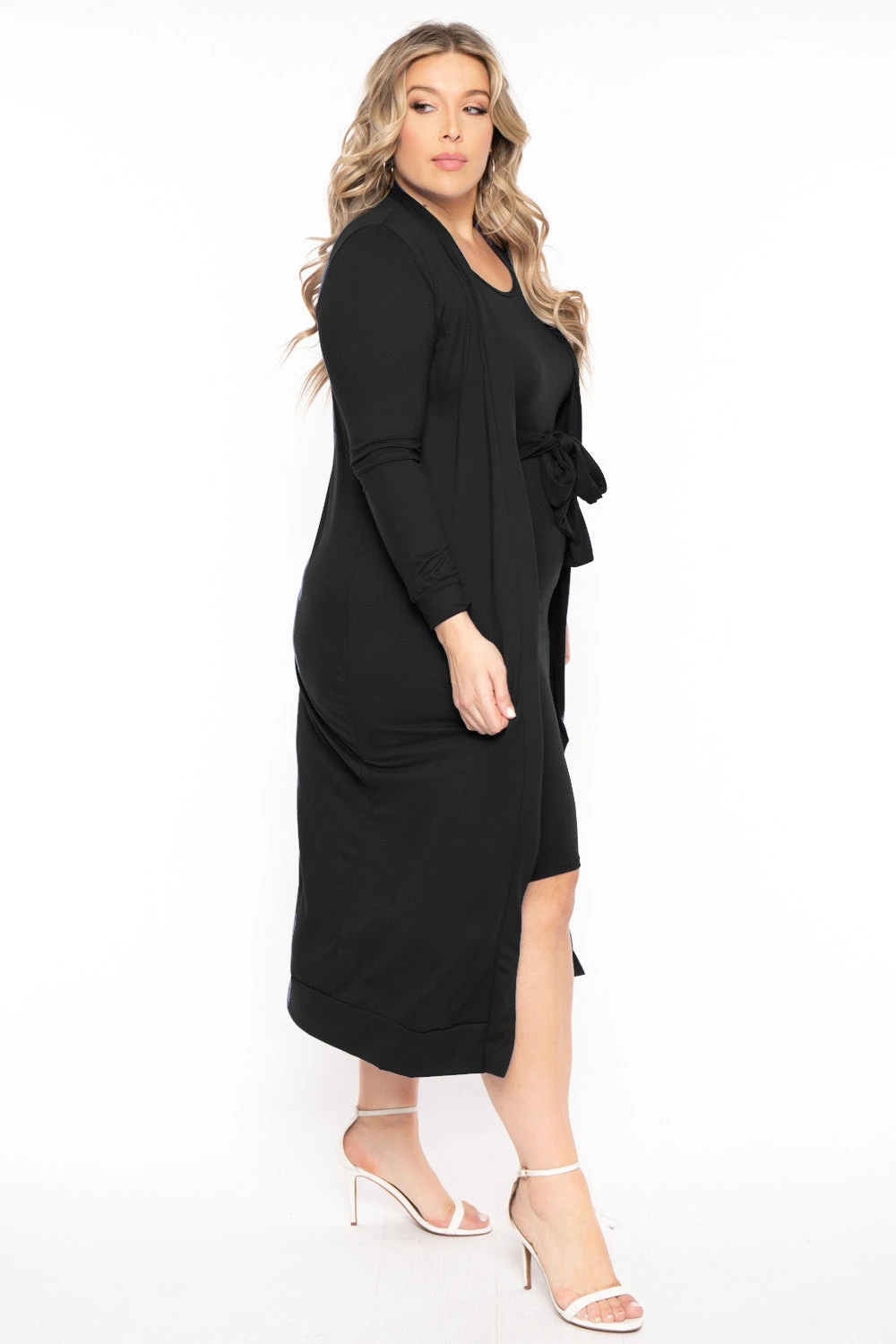 This plus size, stretch dress features a round neckline, sleeveless, self tie sash at the front and a matching cardigan with slim sleeves