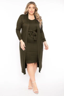 This plus size, stretch dress features a round neckline, sleeveless, self tie sash at the front and a matching cardigan with slim sleeves