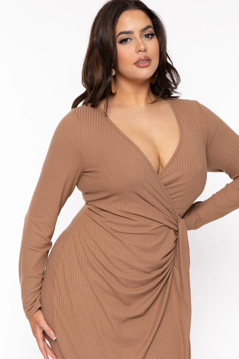 This plus size, ribbed dress features a cross over v-neckline, long sleeves, front draped panel with a wrap illusion.
