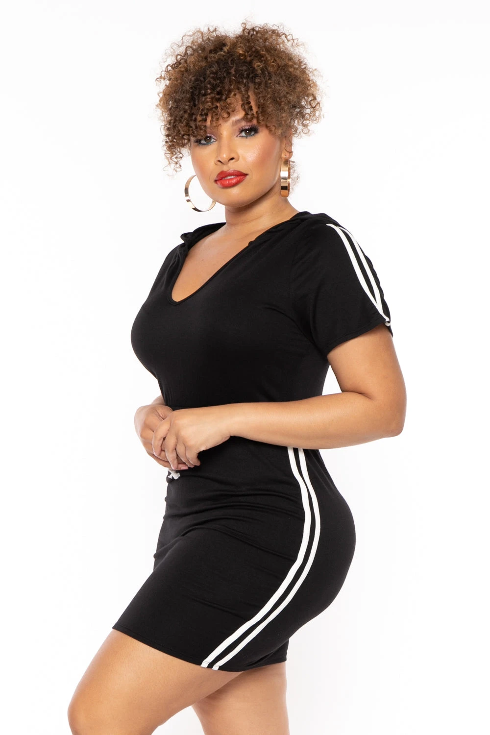 This plus size, stretch knit dress features an attached hood, V-neckline, short sleeves with sporty varsity-striped trim, an elastic banded waist with contrast self-tie drawstring detail, a sporty varsity-striped trim on sides, and a bodycon silhouette.