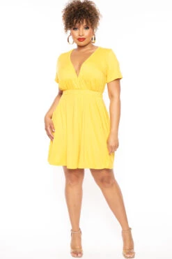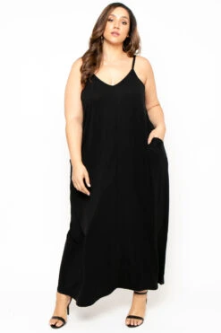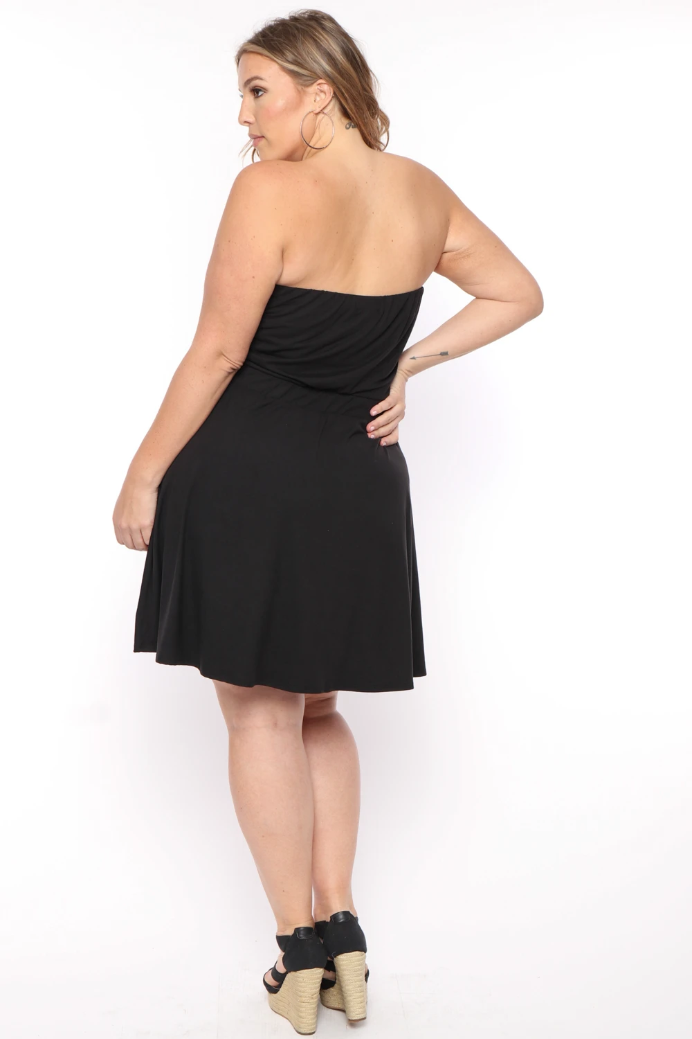 This plus size, stretch knit dress features a strapless neckline with elastic for better support an elastic waist and self-belted, front side pockets, and a flowy silhouette.