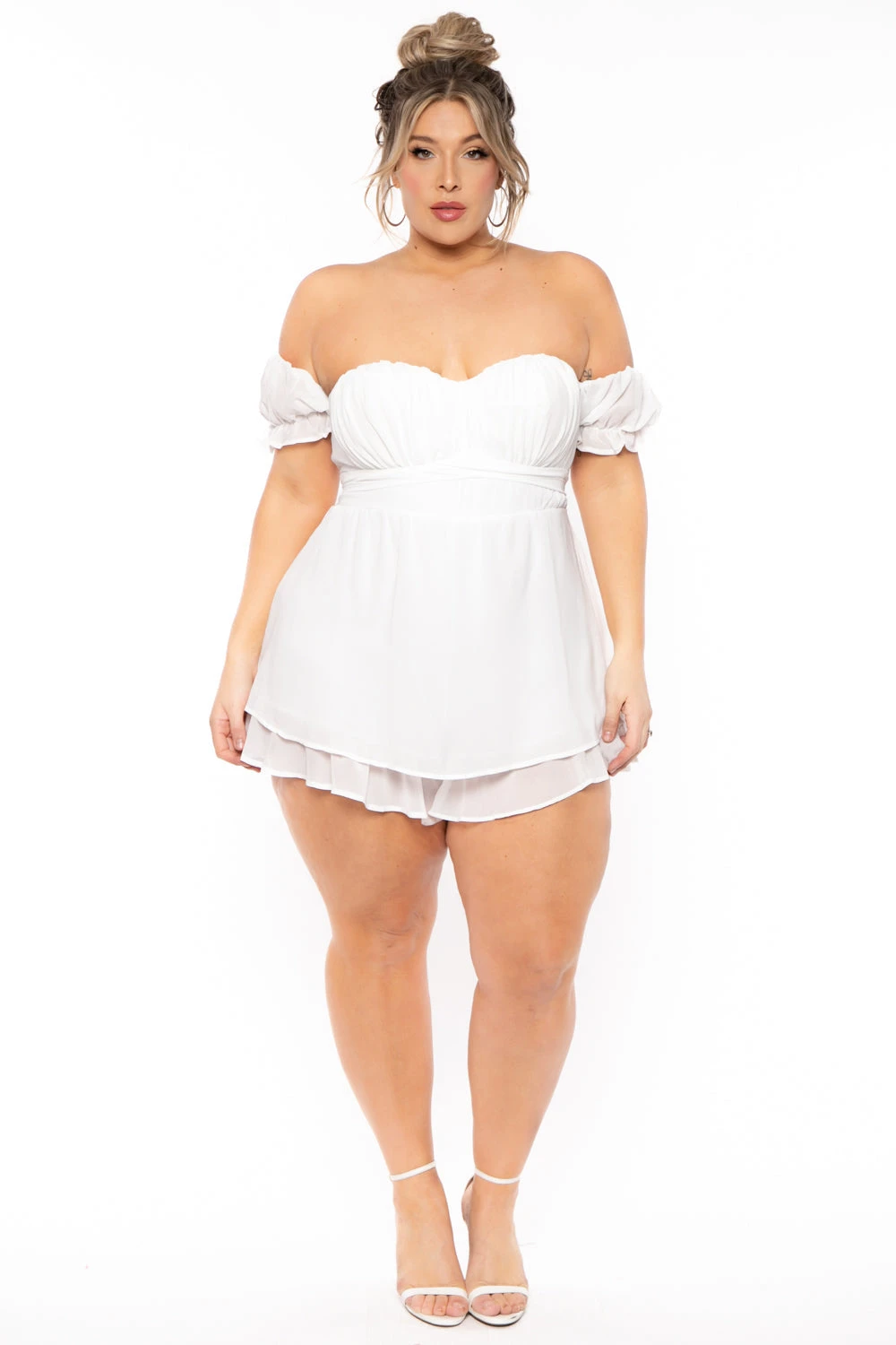 This plus size, romper features a sweetheart neckline, off shoulder sleeves, hidden back zipper, self tie sash fully lined, and a form fitting silhouette
