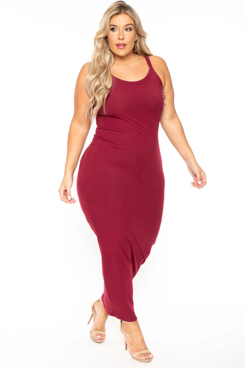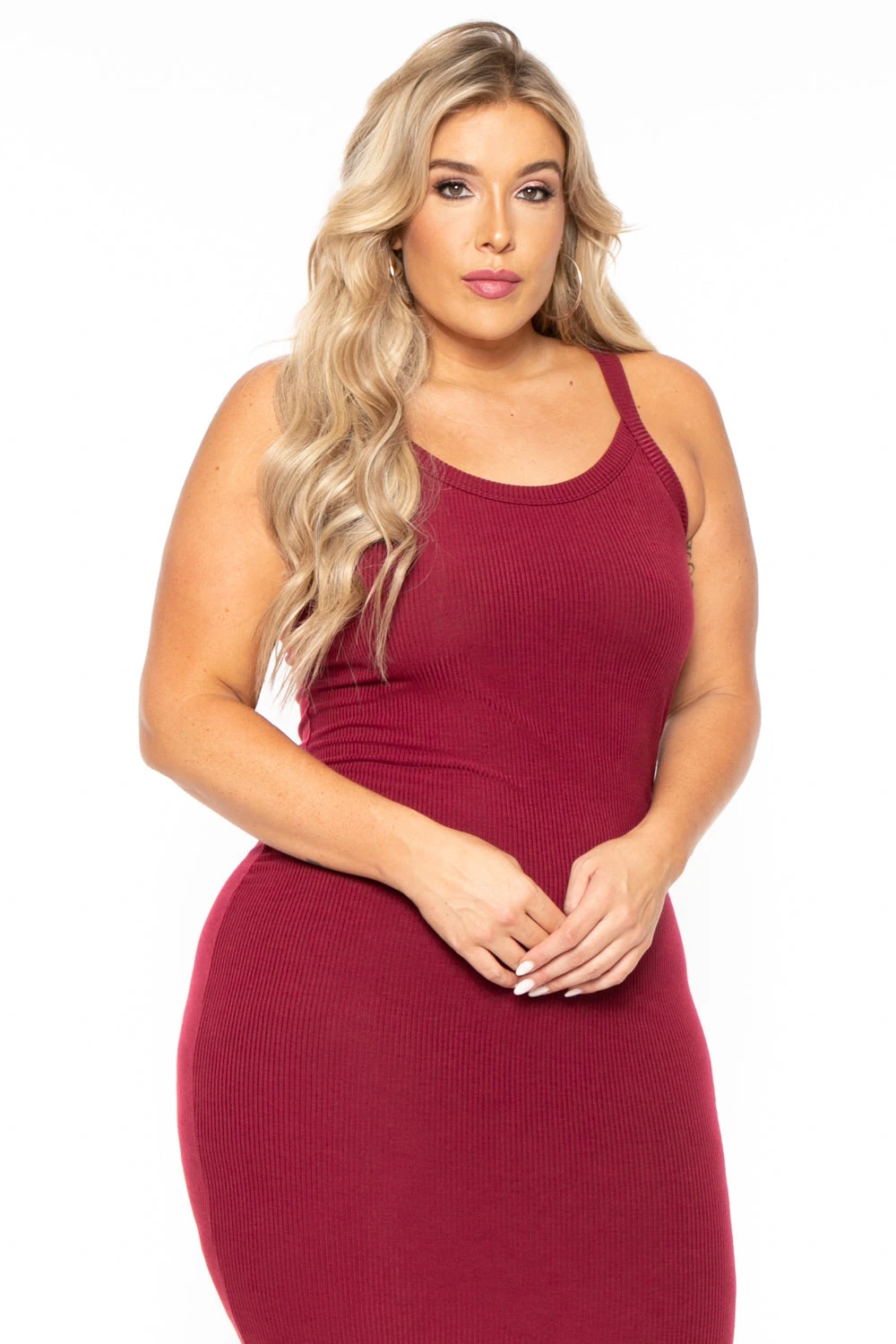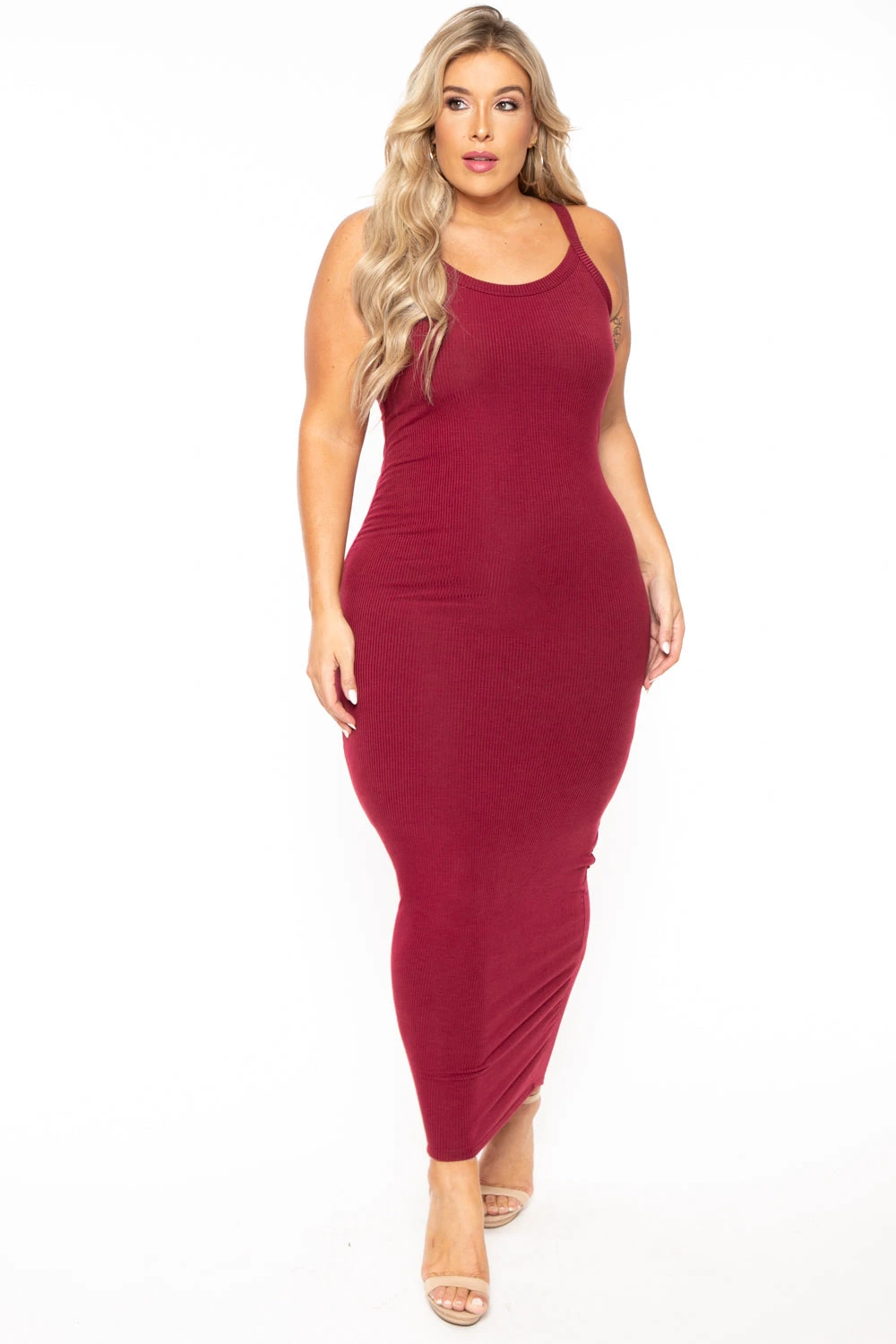 This plus size, ribbed lightweight knit dress features a curve hugging silhouette, sleeveless, scoop neckline and great basic to dress up or down!