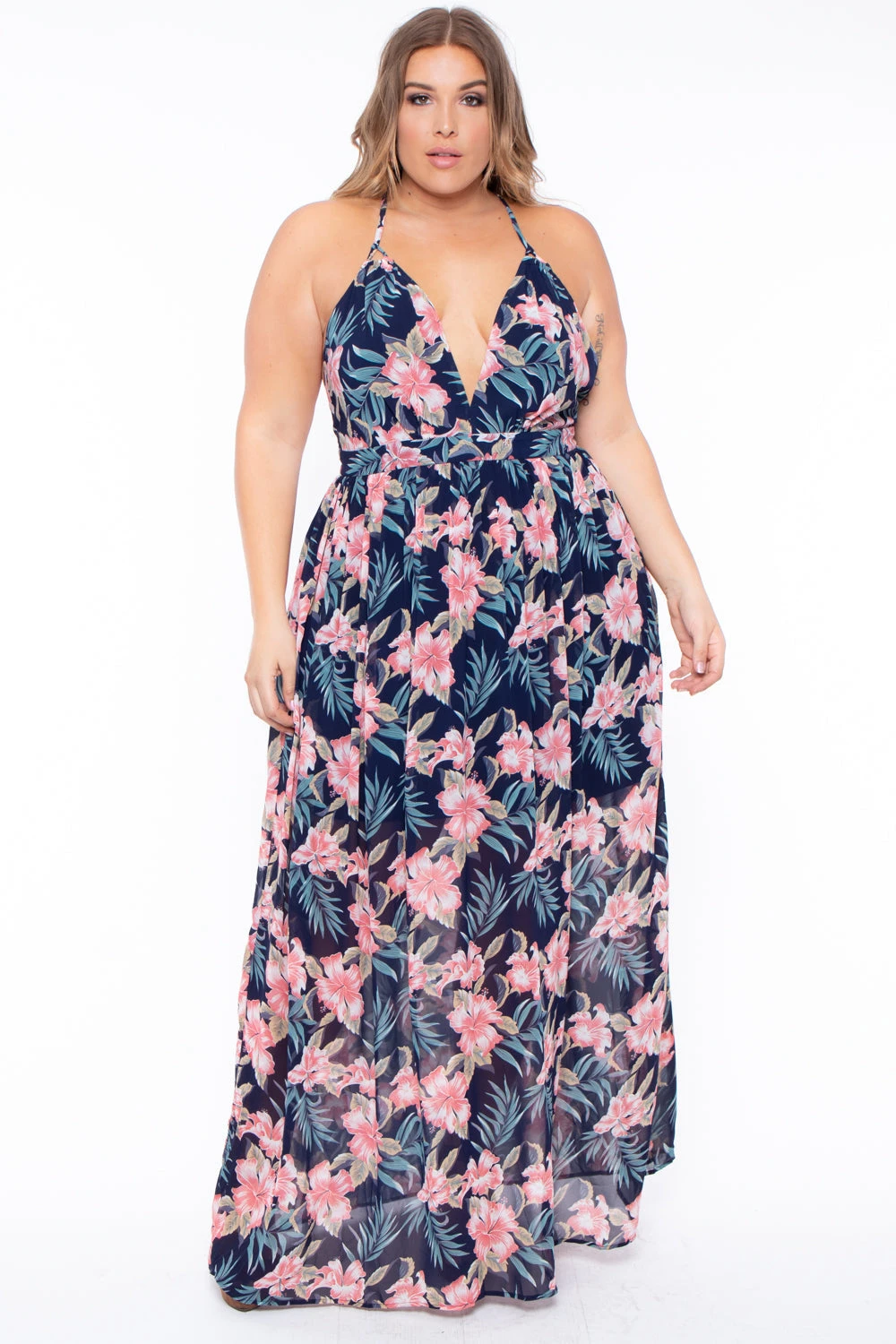 This plus size, woven maxi dress features an all-around beautiful tropical floral print, a plunging halter neckline, cami straps that crisscross in back, fully lined, and a flowy silhouette