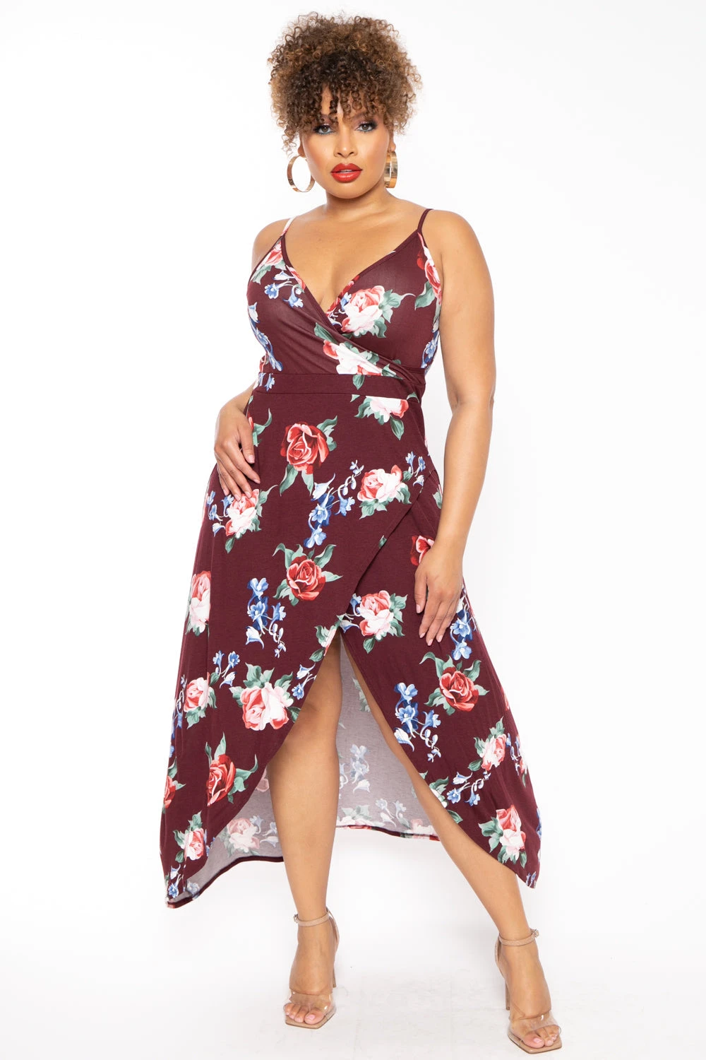 This plus size knit cami dress features a v-neckline with a cross wrap detailing, a sleeveless cut, adjustable straps, a floral print, a waistband, and an envelop bottom hem.