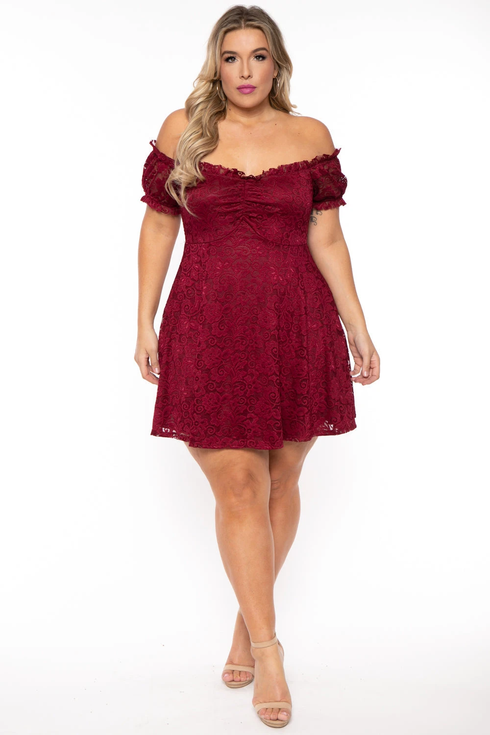 This plus size, lace off the shoulder dress features a subtle sweetheart neckline, in a flowing silhouette, with a full lining.