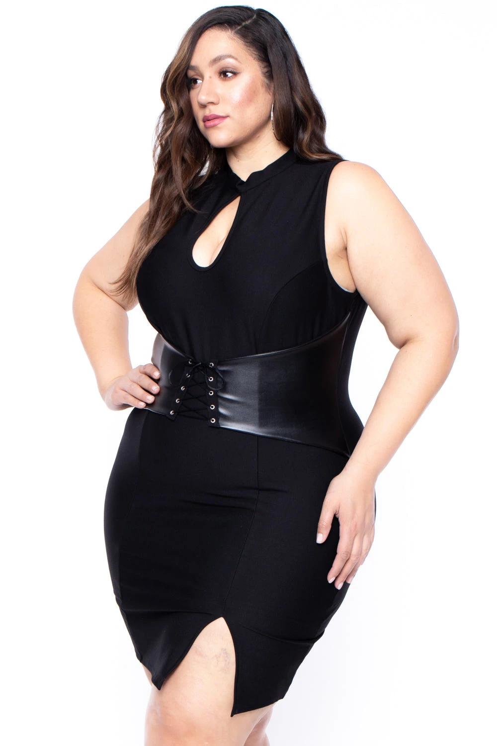 This plus size, stretch-knit dress features a high round neckline, a front and back keyhole with button closure, princess seams, a bodycon silhouette, an attached wide belt with lace-up feature, and a thigh slit at bottom hem.