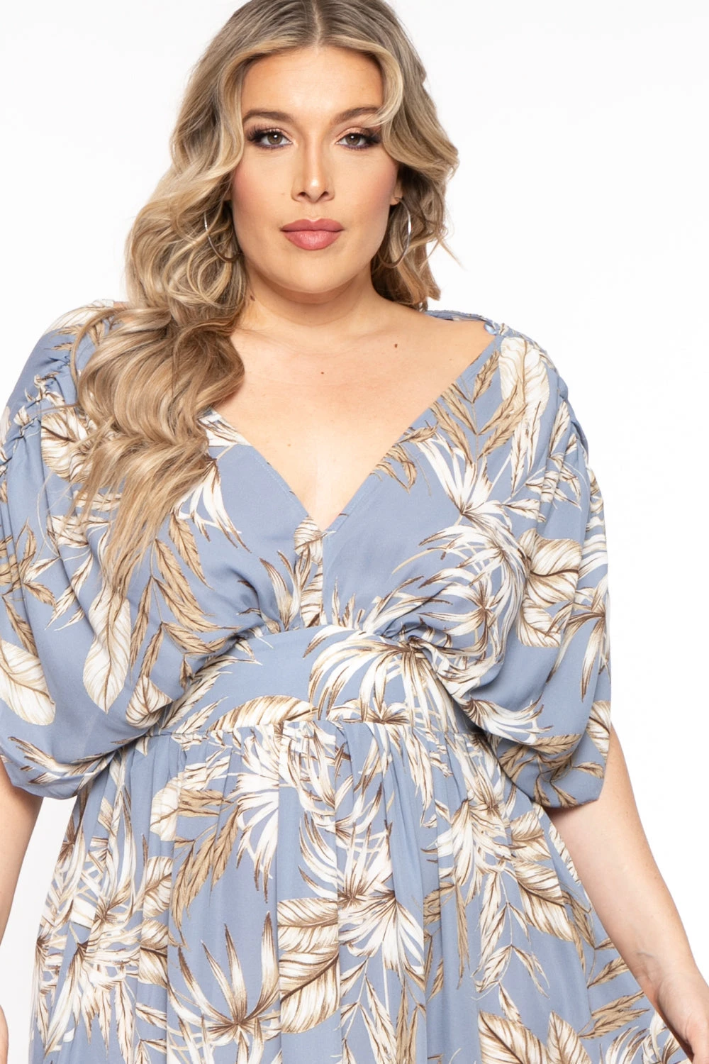 This plus size, stretch dress features and all over palm print, a v-neckline, short sleeves, keyhole back with a dome button closure and a high low hem.