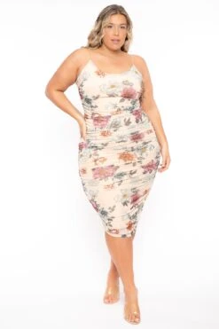 This plus size, stretch-knit dress features a v-neckline, an allover rose garden mesh print, fully lined, contrast spaghetti straps, ruched detailing, bodycon silhouette.