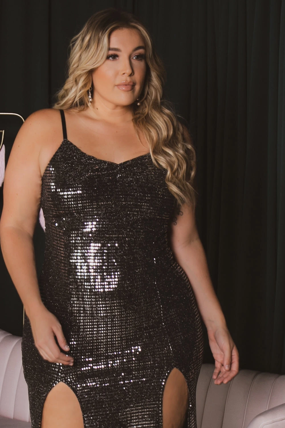 This plus size, stretch knit maxi dress features an all over metallic sequin detail a v-neckline, adjustable straps, and a dramatic front M-slit.