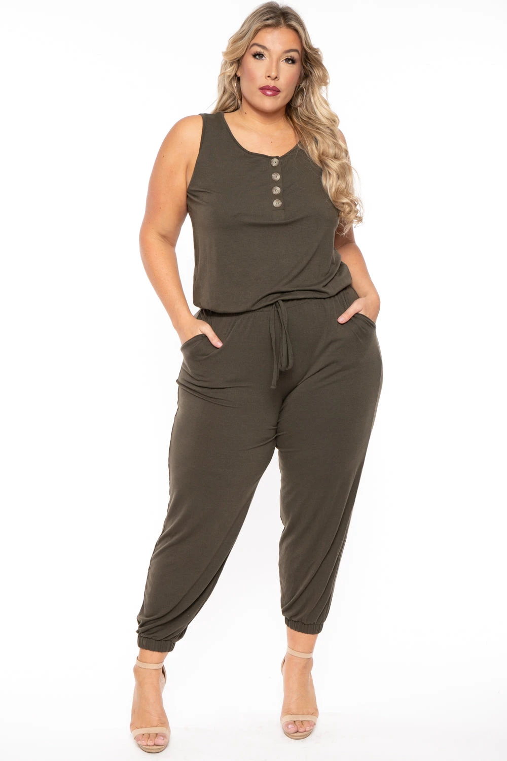 This plus size, stretch knit lightweight lounge jumpsuit features a round neckline 4 front button-up closure sleeveless cut with elastic hem, an elastic waistband for added comfort, and self-tie detail side pockets, a relaxed fit, and a skinny leg with elastic hem.