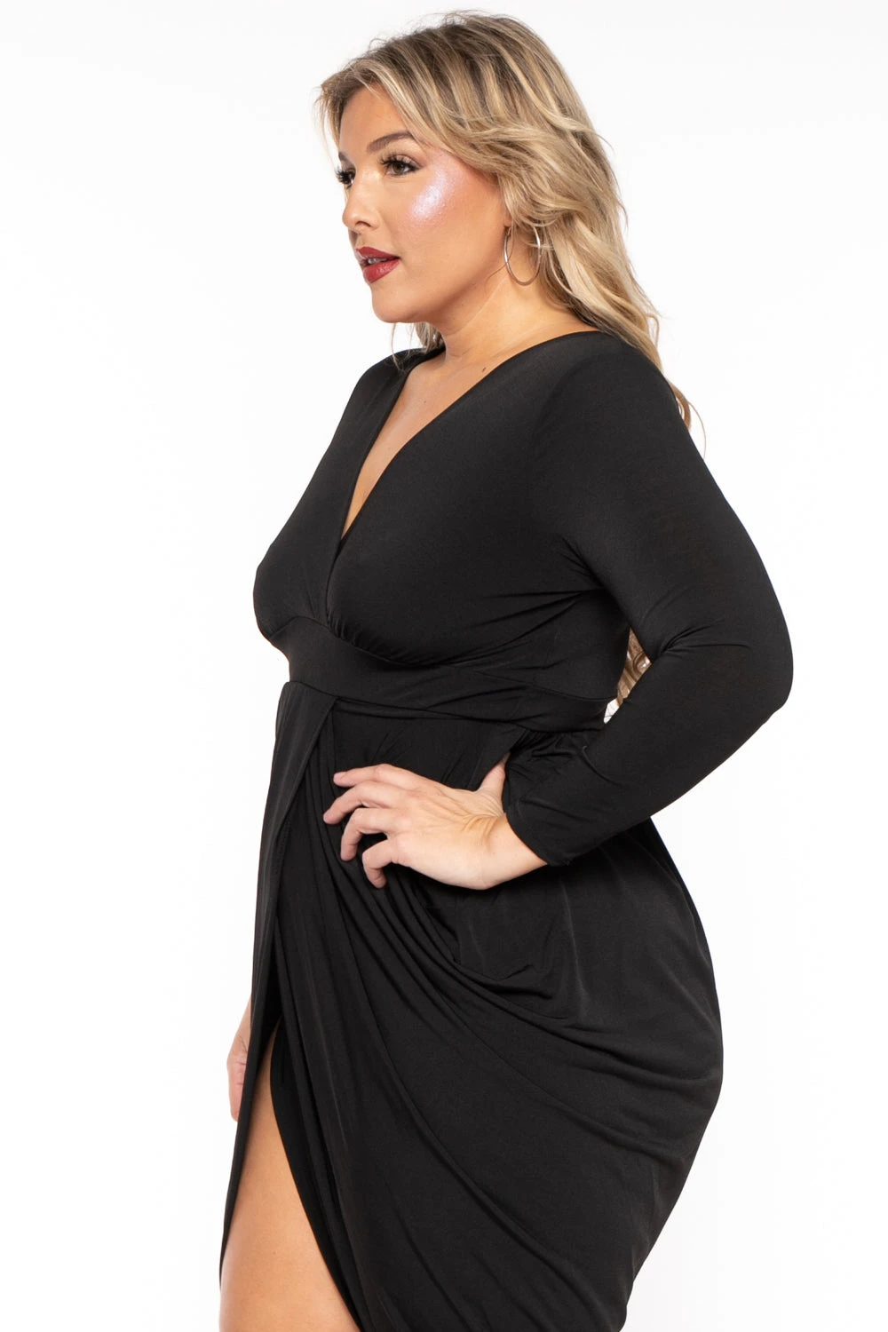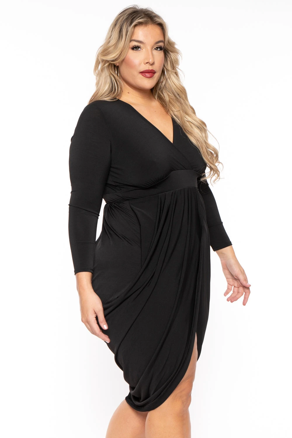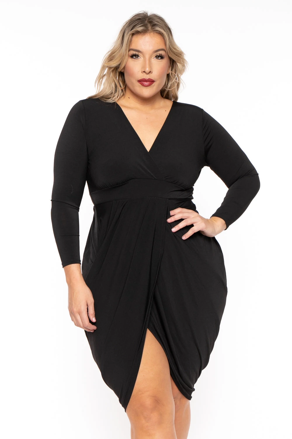 This plus size, stretch asymmetric dress features a surplice neckline 3/4 sleeves elastic at the wait making a gathering detail, sides drape, and front asymmetric hem